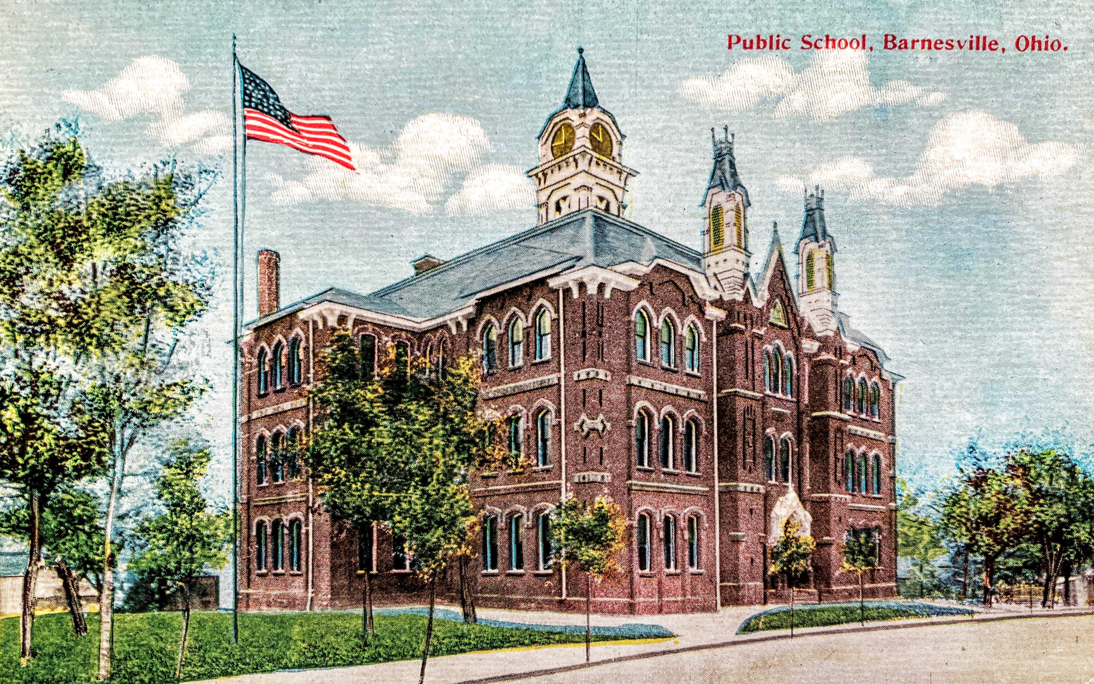 The Monroe County Courthouse in Woodsfield was destroyed by fire and a replacement was constructed in 1868/69. Note the references at the end of each of these two articles that appeared in the local Spirit of Democracy newspaper at that time. Yost would have been age 21…and thus his career in the building industry began with hands-on carpentry work. Photo credit: Trish Caldwell Landsittel.In 1872, Warren married Anna Trevana Wetherald of Bellaire, Belmont County. Anna was an artist. Perhaps the background of this self-portrait is the farm of Yost’s parents. Photo credit: Steven Flower.Barnesville, Belmont County: City Hall. 132 North Arch Street. Built 1879. Included two bays for fire equipment, jail, and caretaker’s residence. Photo credit: Barnesville’s 200 Years, A Pictorial History.Today the building houses city administrative offices and the police.Barnesville: Public School. Built 1879. Church Street. Razed. Photo credit: Barnesville’s 200 Years, A Pictorial History.