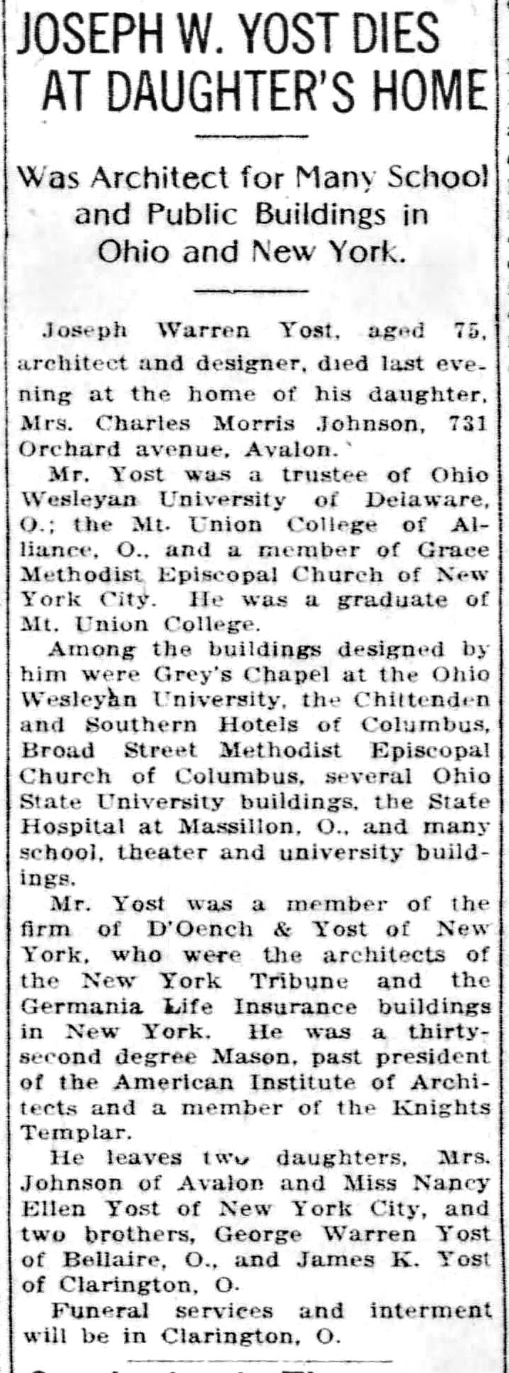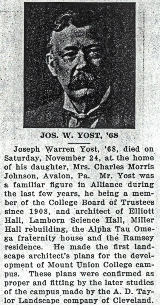 In 1900, Warren Yost moved to New York City and teamed with Albert Frederick D’Oench to co-found D’Oench & Yost. (Frank Packard continued to practice architecture until his unexpected passing in 1923). This blog is concentrated on Ohio so Yost’s West Virginia designs during his Bellaire years and his New York designs (large office buildings) are not included here. Though no longer based in Ohio, Yost continued design work here including Edwards Gymnasium (1905) and Sanborn Hall (1909) at Ohio Wesleyan University in Delaware. In 1907, Mount Union awarded him a Masters degree that “was not honorary but conferred from merit” as published in a Mount Union College Bulletin of late 1923. D’Oench passed away from the lingering effects of stroke in 1918. Yost continued the practice, but eventually retired to his daughter’s residence in Avalon, Pennsylvania, where he passed away in November of 1923. Packard died unexpectedly of a stroke the previous month. All three architects have Wikipedia pages.