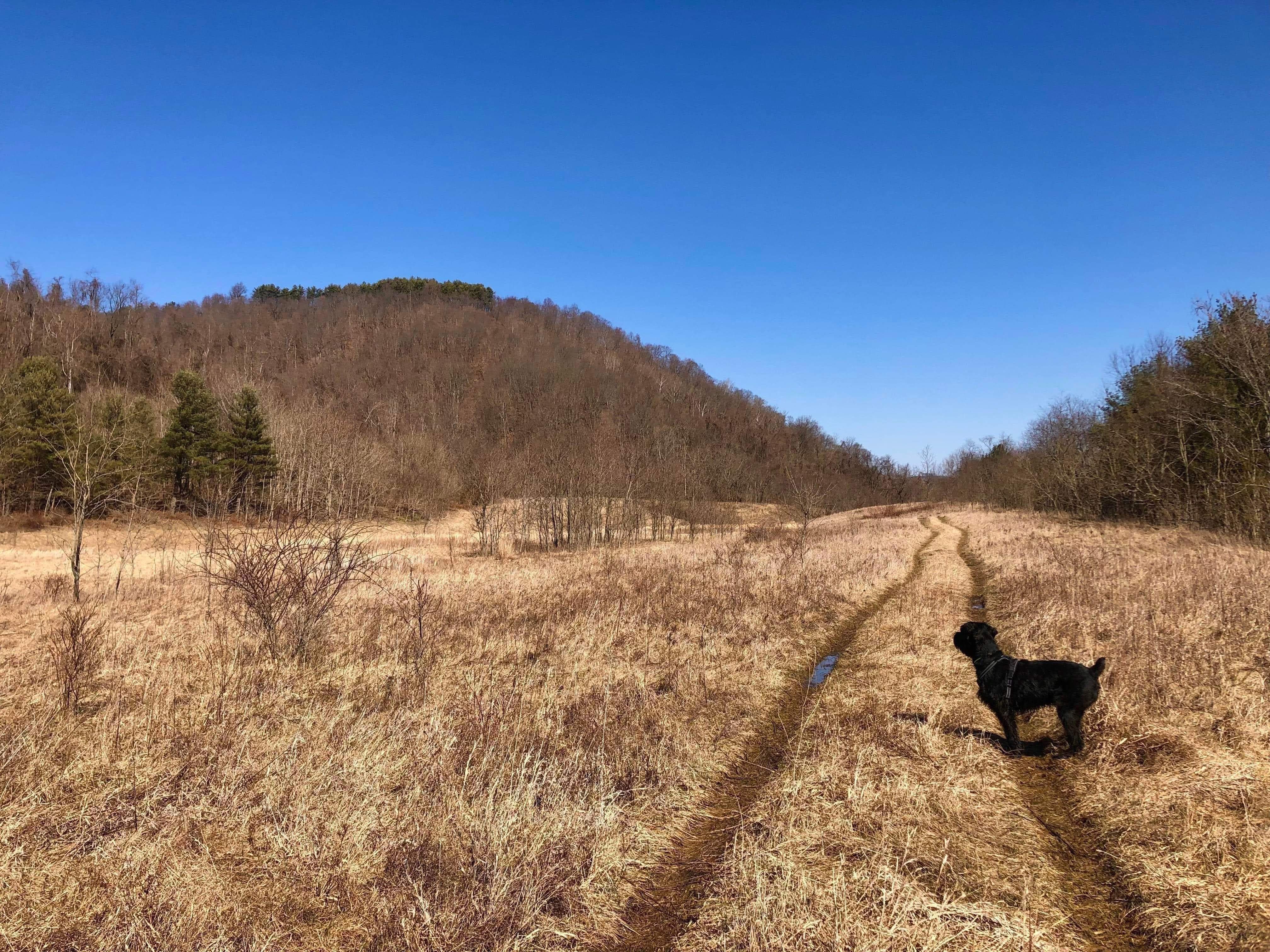 Per Taylor Abbott, Treasurer of Monroe County (and a steamboat historian): “Today, the former Yost farm is part of property that is owned by the State of Ohio and some of it by QUARTO Mining. All of it is permissible and accessible for hiking, albeit, experienced hikers who can handle steep terrain as there are no paths other than those carved out by deer.” Taylor’s Schnauzer Juniper thinking this is as far as I go.