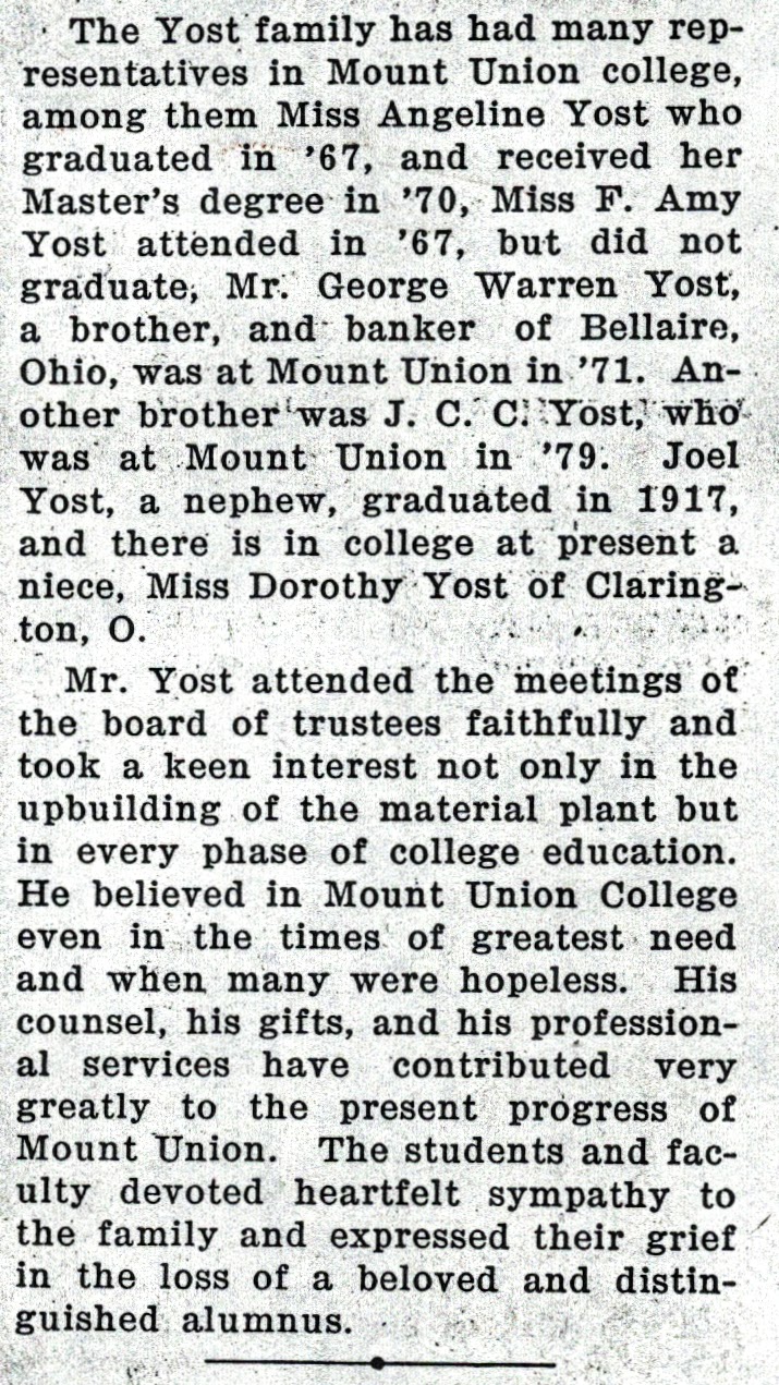 I would like to thank the following individuals for their assistance in contributing to this blog: Taylor Abbott, Monroe County Treasurer; Susan Adams, Harrison County historian; Steven Flower, 3x great-grandson of Joseph Warren Yost; Myla Ford, Library Assistant, Bellaire Public Library; Trish Caldwell Landsittel, Southeast Ohio historian; Erin Rothenbuehler, Director, Bellaire Public Library; Cathryn Stanley, Curator, Belmont County Heritage Museum; Jim Tarbet, Bellaire historian; Alan Zahorsky, Reference/Instruction Librarian, University of Mount Union.