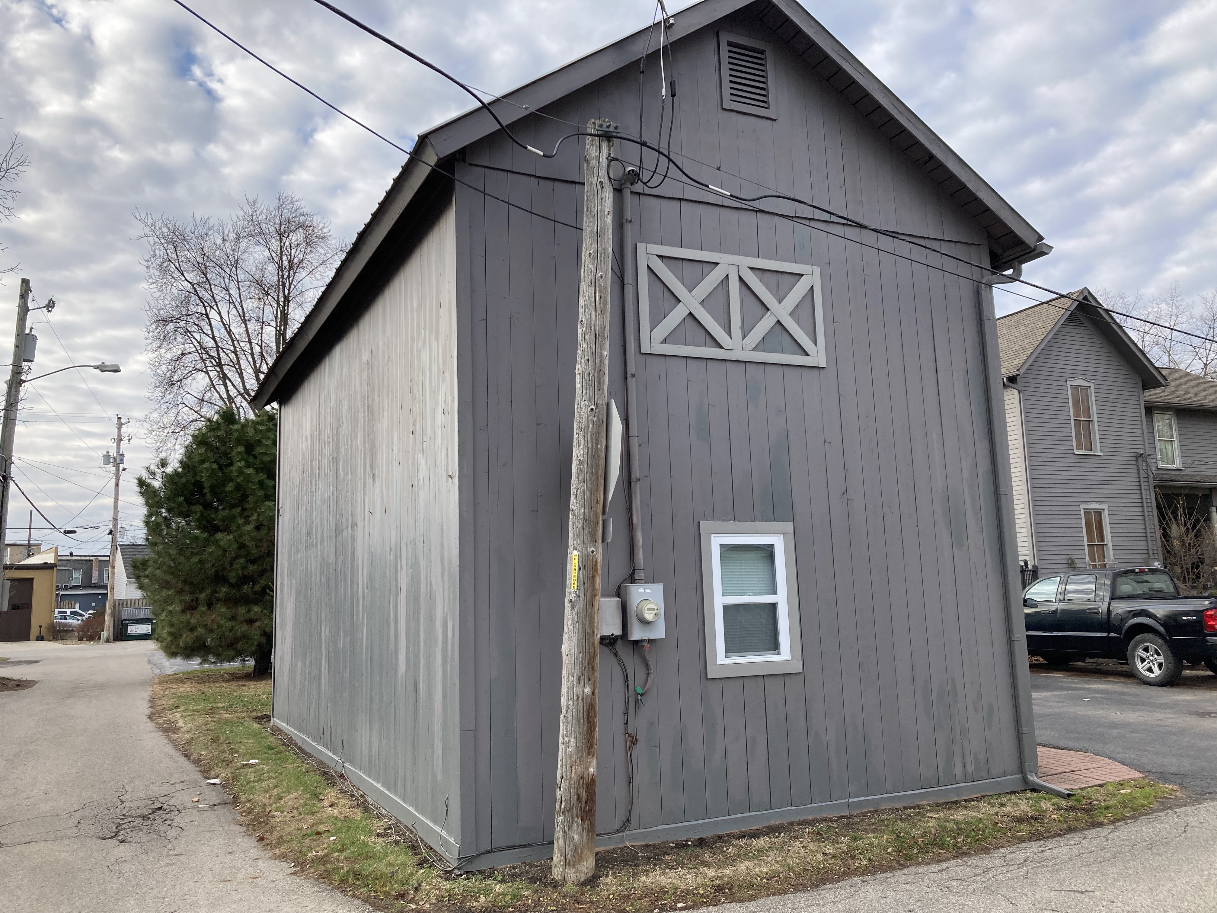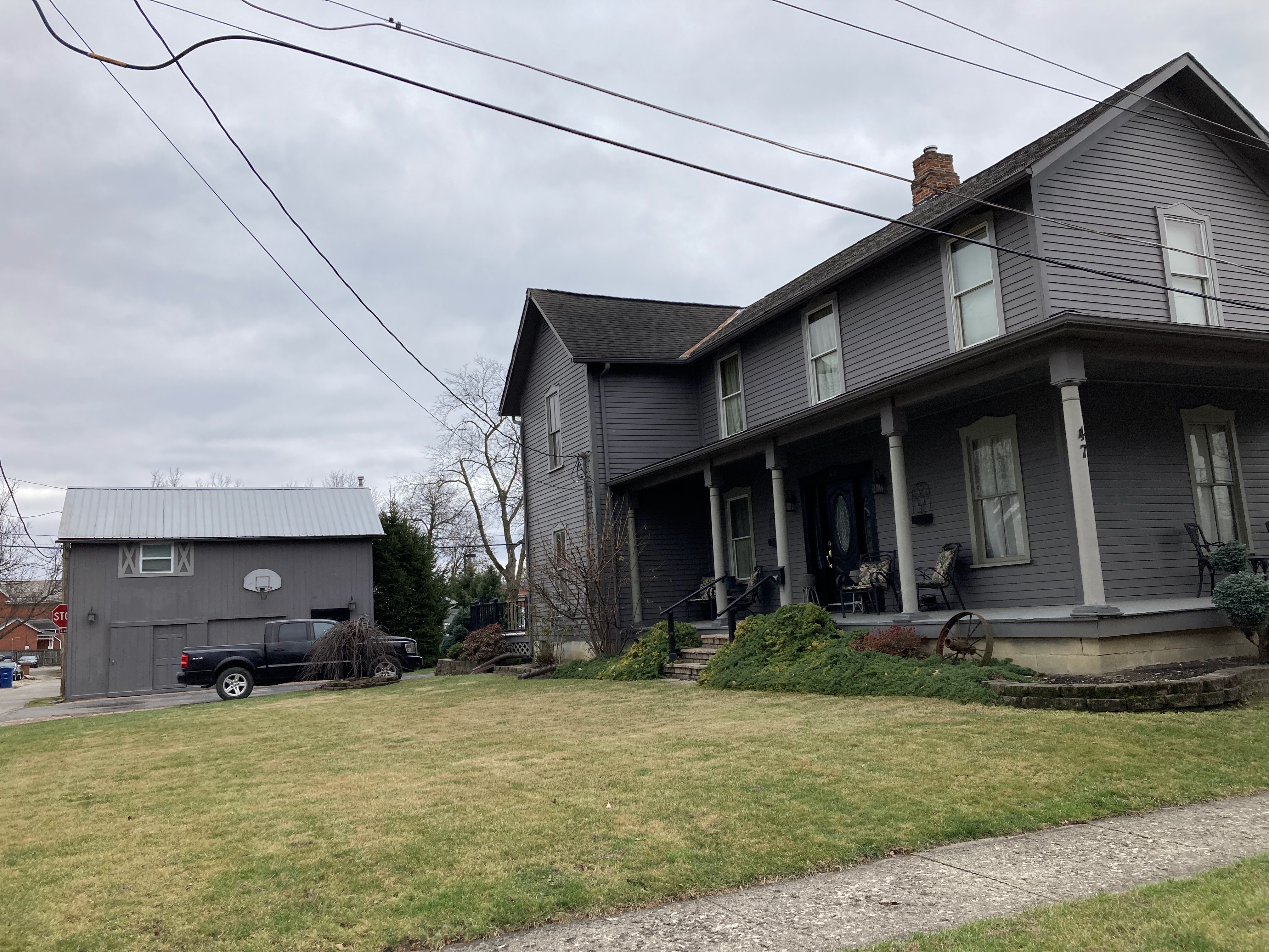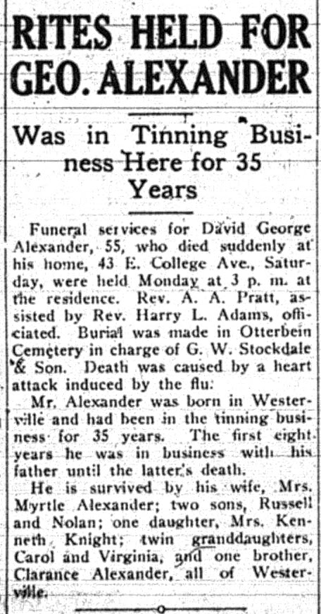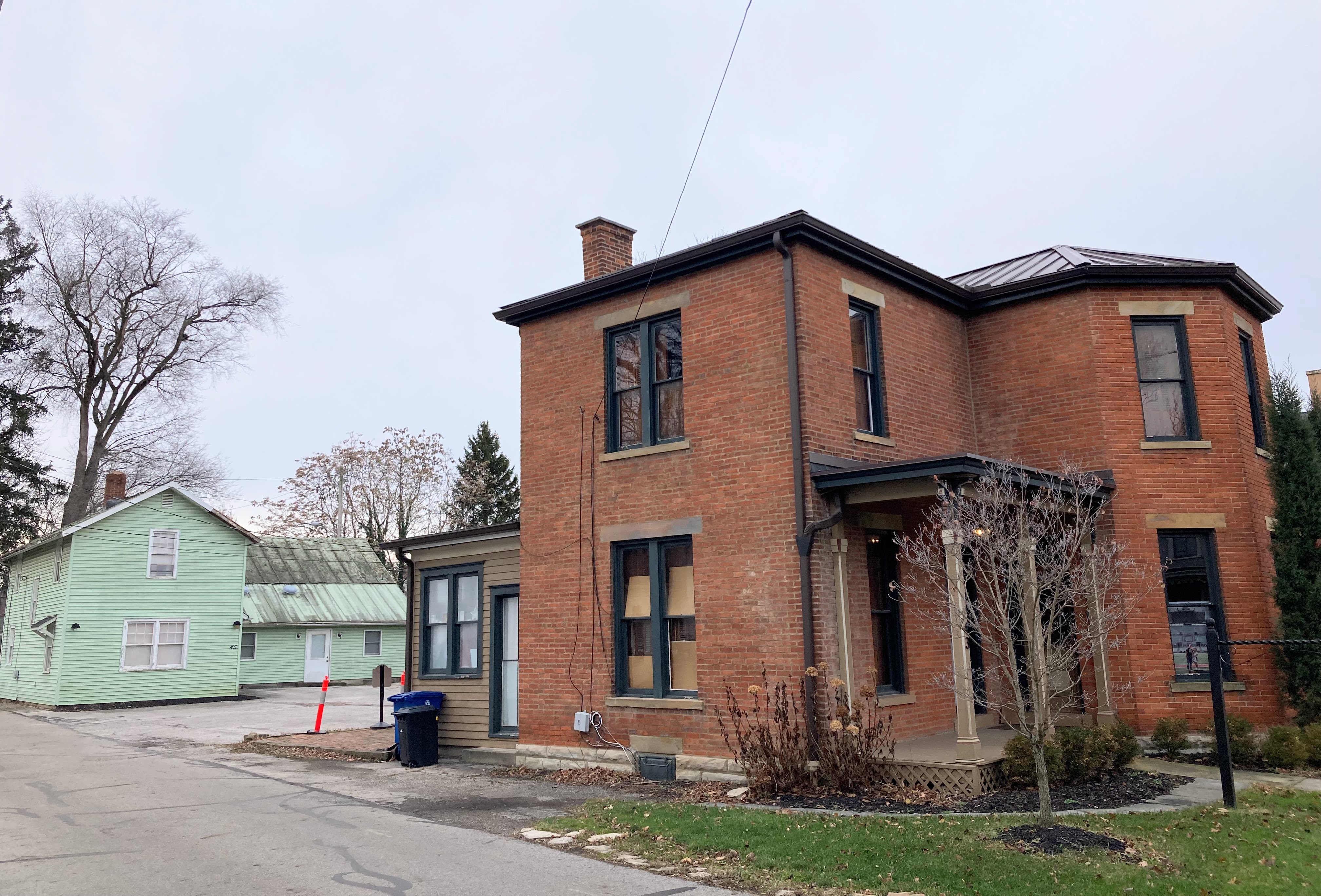 The home of George and Myrtle Alexander, 43 East College Avenue. The tinsmith business was located in one of the two green buildings (not sure which) that were moved together years later and attached. The Westerville Star was made here. This is how the property looks today.