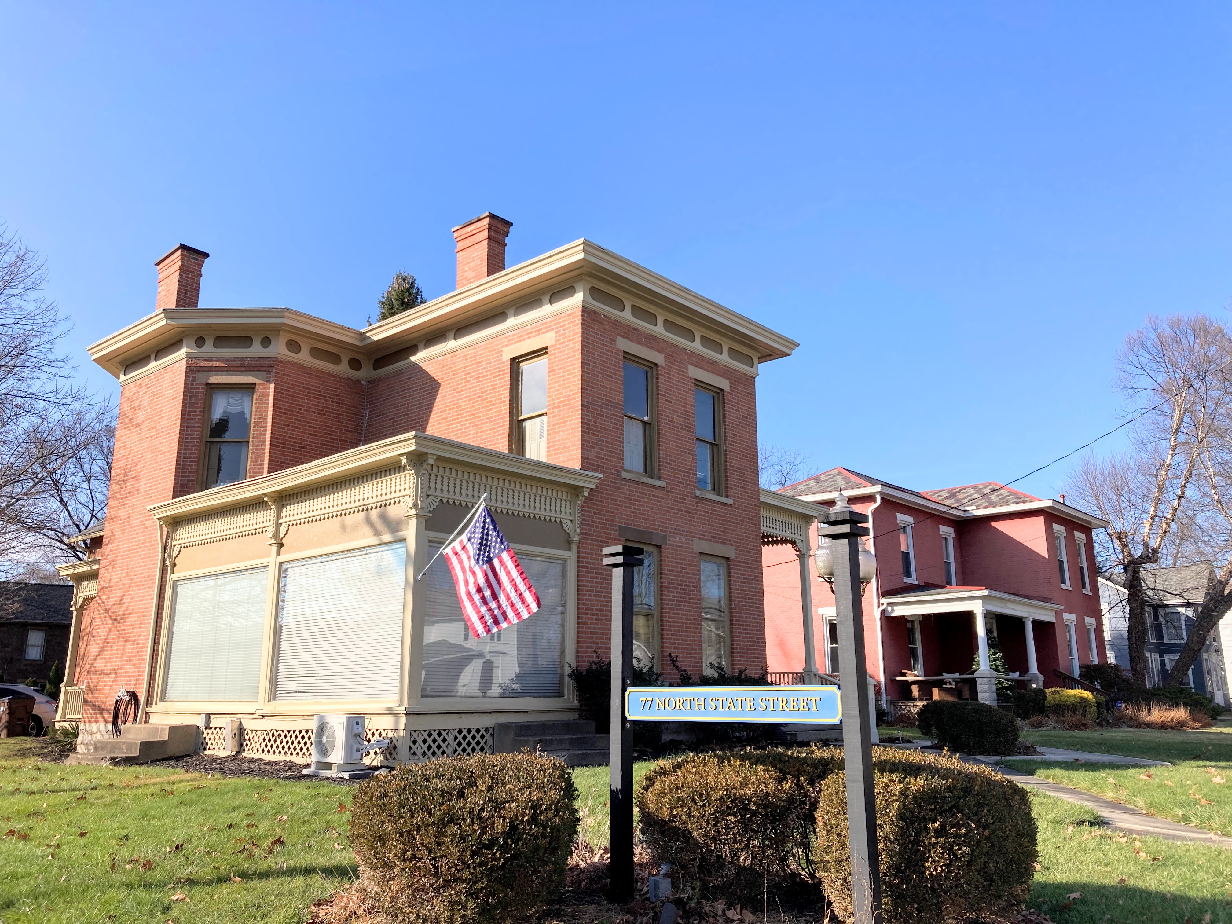 77 North State Street. Residence of Frederick and Ella Brewer Scofield and likely built circa 1880-1885. The Scofields had 2 children. Mr. Scofield opened Scofield’s Dry Goods in 1880 located at 31 North State Street (today occupied by Stone and Sparrow Apparel). Initially his son Lovett worked there. The obituary of Mrs. Scofield, who ran the store after her husband passed away, stated that she “had the distinction of being with the group who rode into town on the first train to arrive here in 1873 when she was 16.”