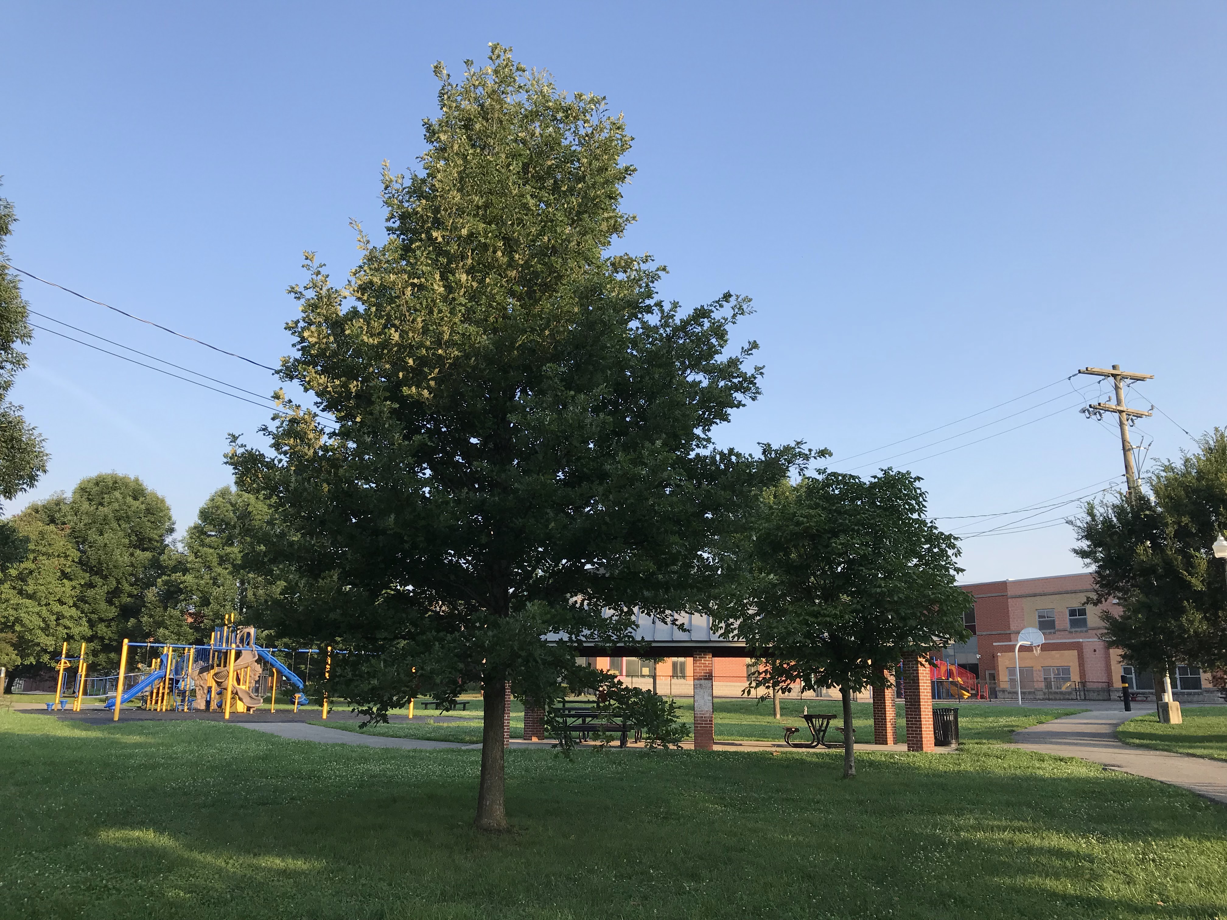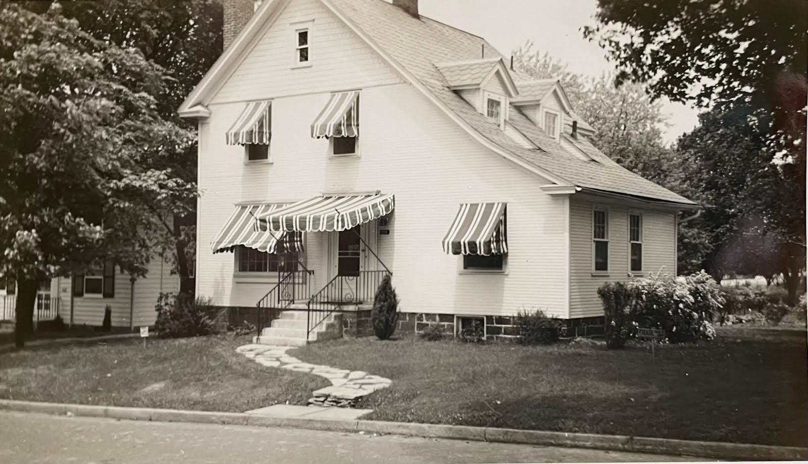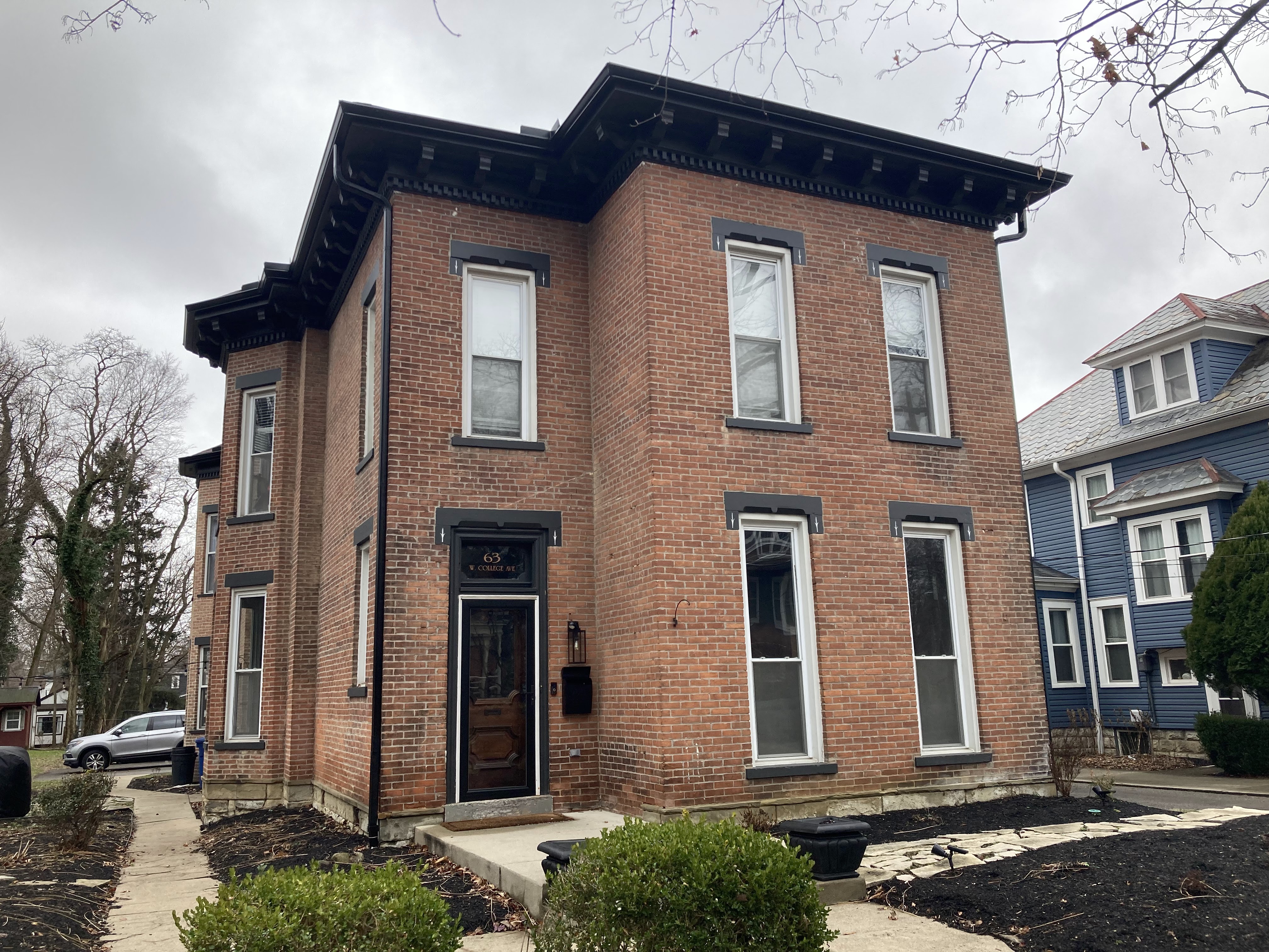A deed to a house located on this lot was transferred from Isaac and Prudence Kingsley to Mary Coggeshall on 12/31/1879. The footprint of a house appears here on an 1866 map of Westerville. It was razed in 1927 by later owners Frederick and Emma Thomas to build the house pictured.Another view of 80 West College Avenue. Towers Hall on the Otterbein University campus is in the background.