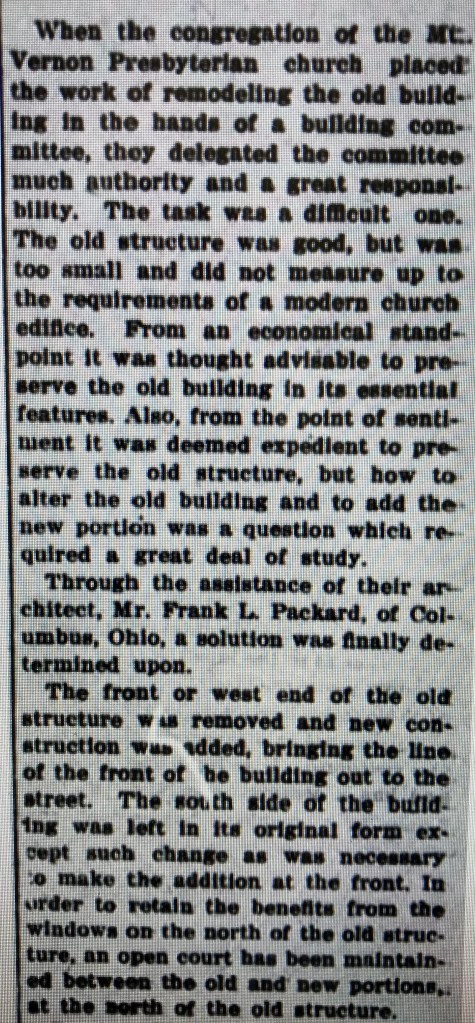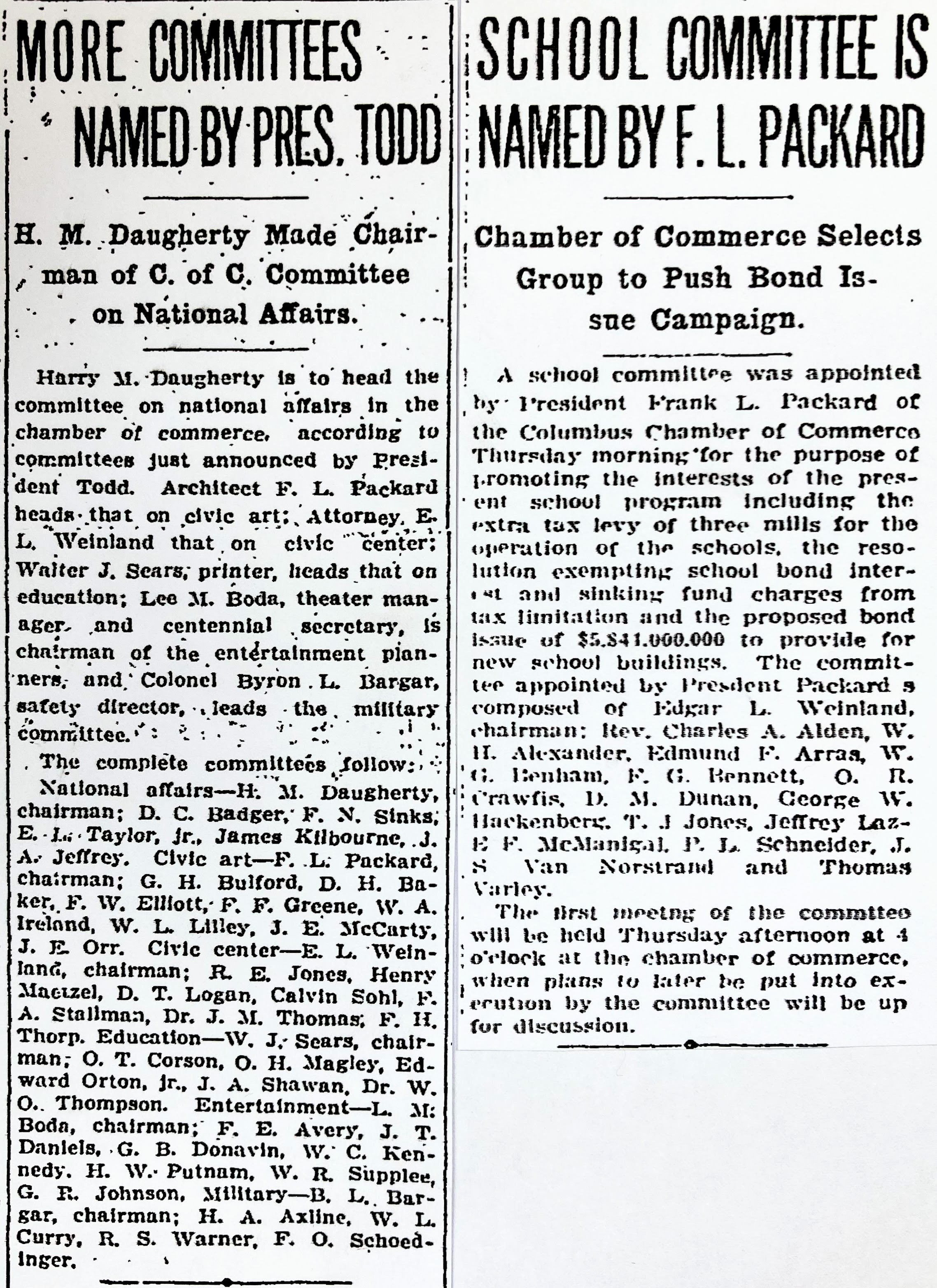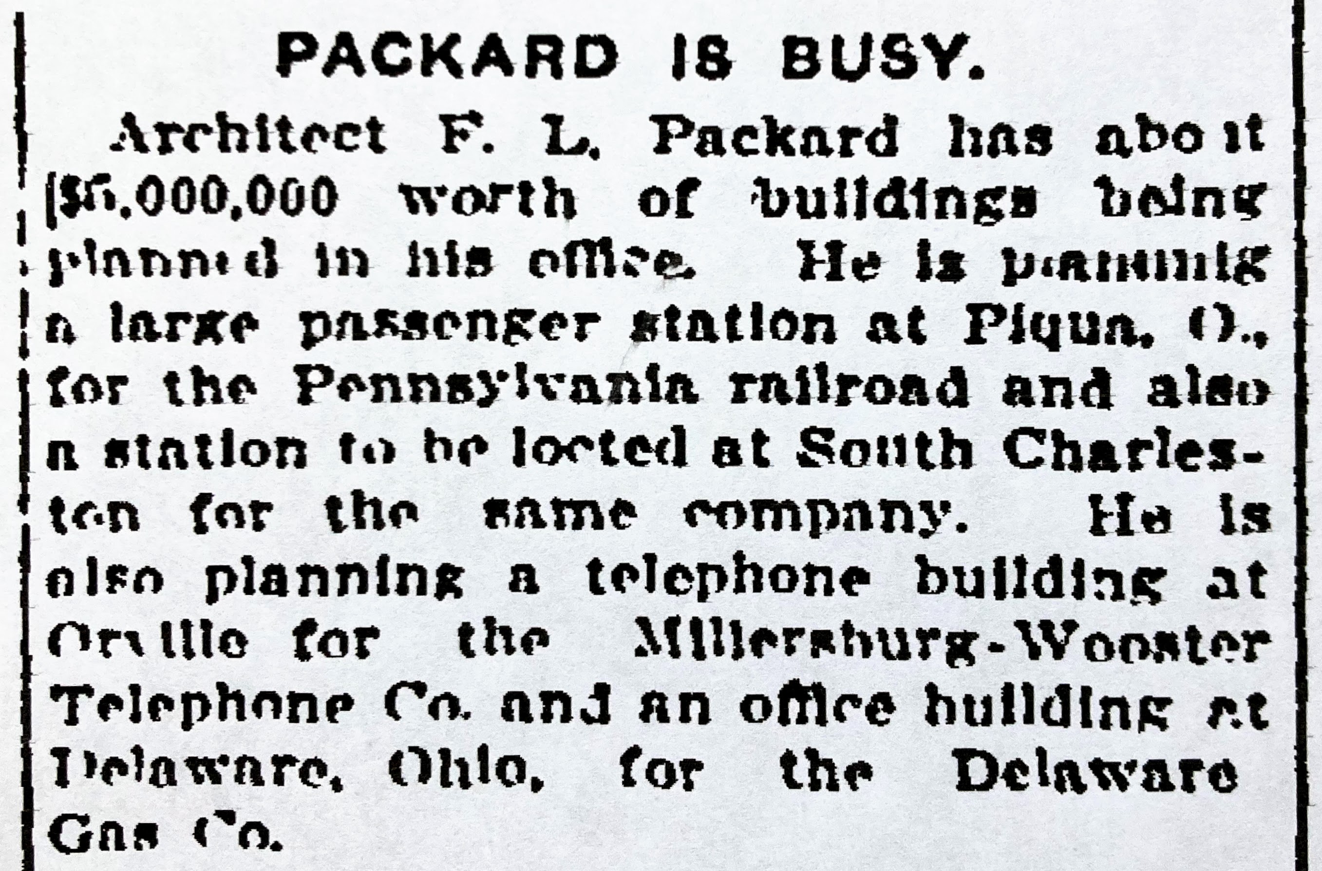 “Noted Architect Did Work in Westerville. The death of Frank L. Packard, noted architect of Columbus, recalls to many Westerville people the fact that he was the architect of the Vine Street school building. Mr. Packard was also developing the Otterbein College building program. He was well known by many Westerville people.”