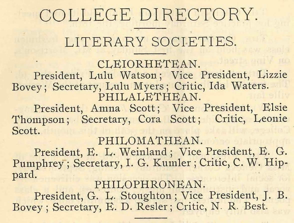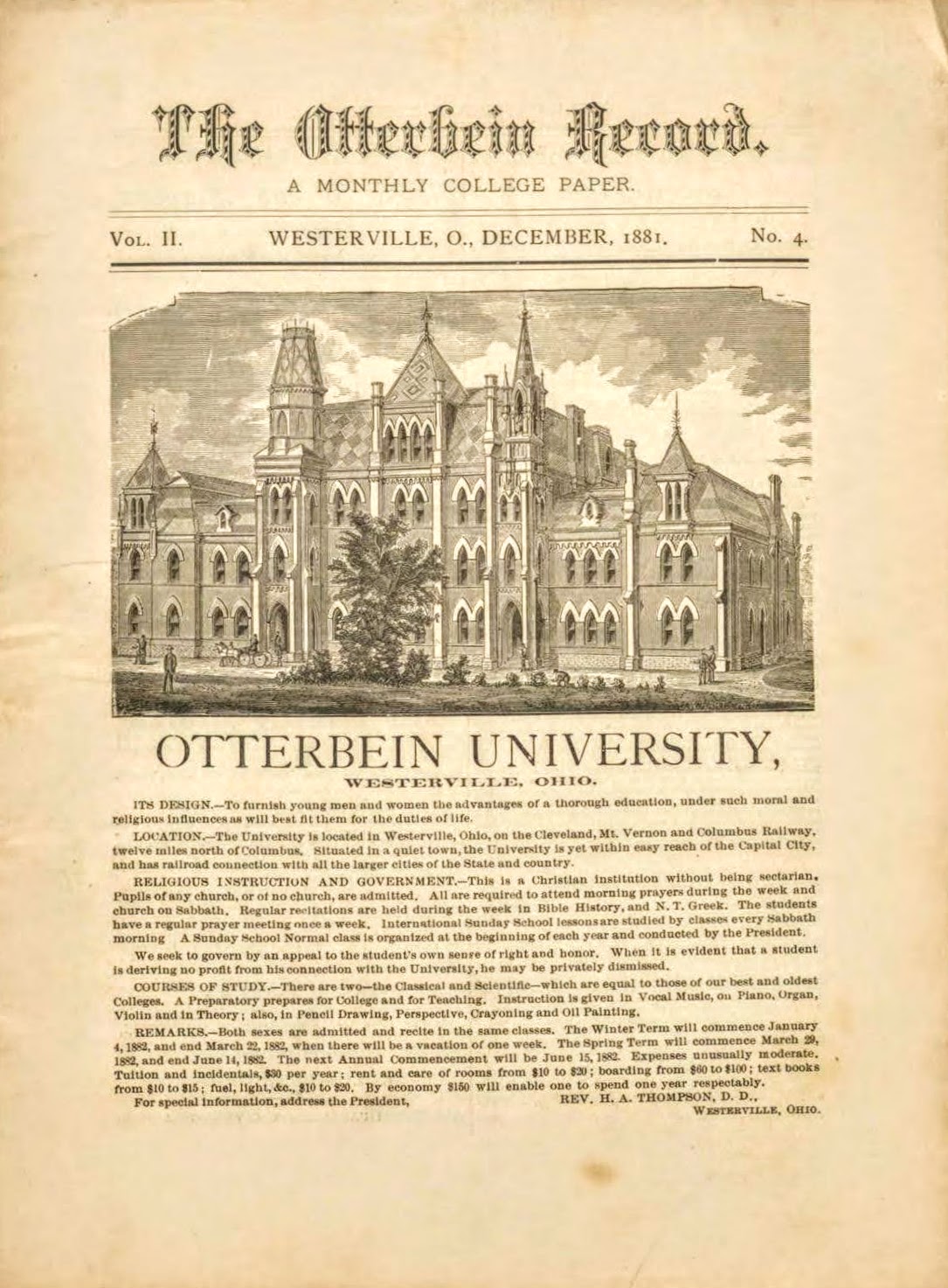 Prockie attended Otterbein through her sophomore year of 1880/81. The page below is from The Otterbein Record of 12/1881 pictured above. Photo credit: Otterbein Digital Commons.