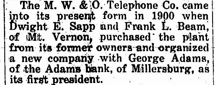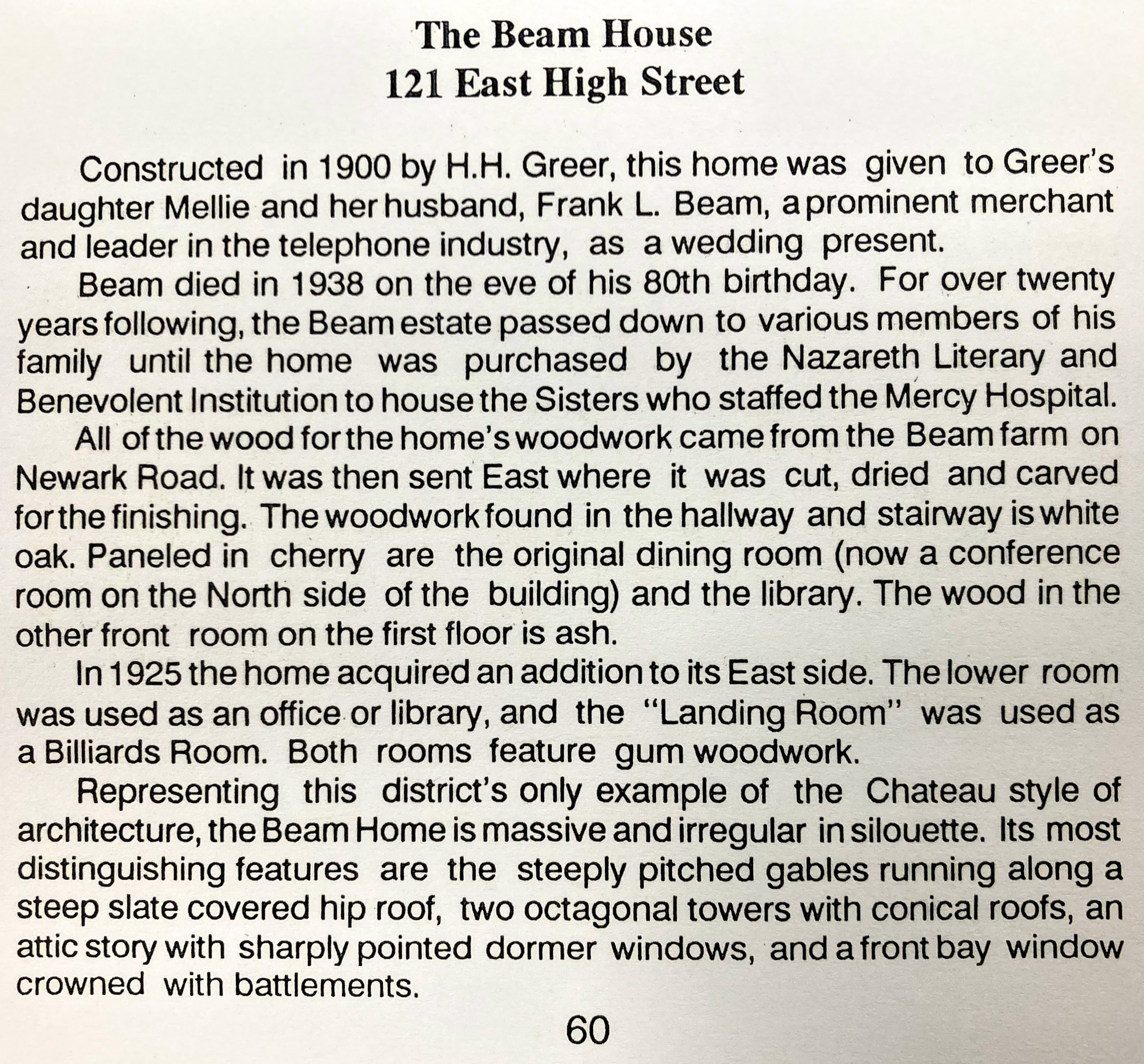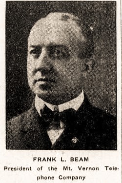 “Mr. Beam began his business career as a clerk in a hardware store in Mount Vernon. In 1880, he engaged in the crockery and wallpaper business here, which he continued until 1901. In 1895, he became interested in the independent telephone business and organized and was involved in many of the early telephone companies of Ohio. He served as president/general manager of several of them. He was one of a group who organized the Mount Vernon Country Club and served as a member of the Board of Directors for many years. He was a former president of the Mount Vernon Chamber of Commerce and always took a great interest in that organization, as well as many other civic affairs. Mr. Beam also served on the Board of Education. (Source: Mound View Cemetery Self-Guided Walking Tour doc.)” Narrative and picture from Find-a-Grave.