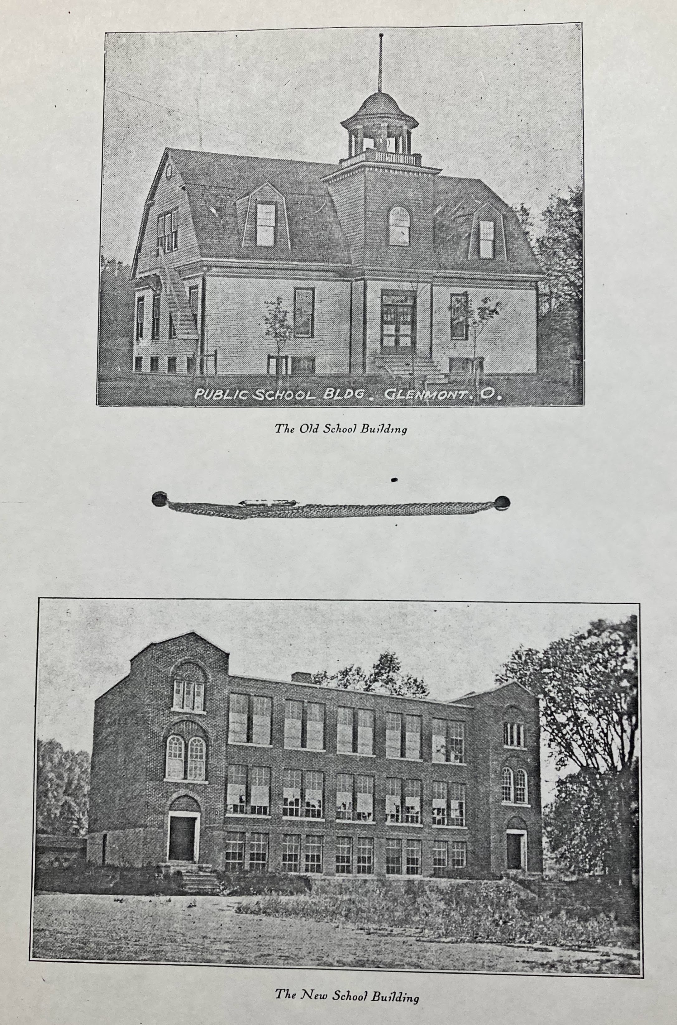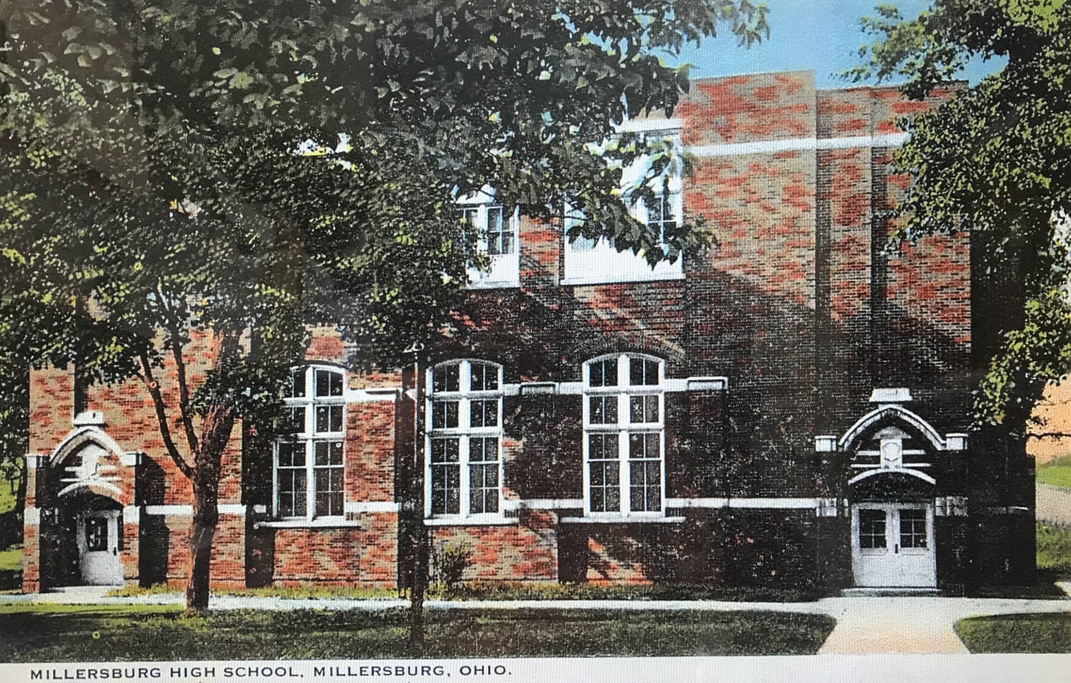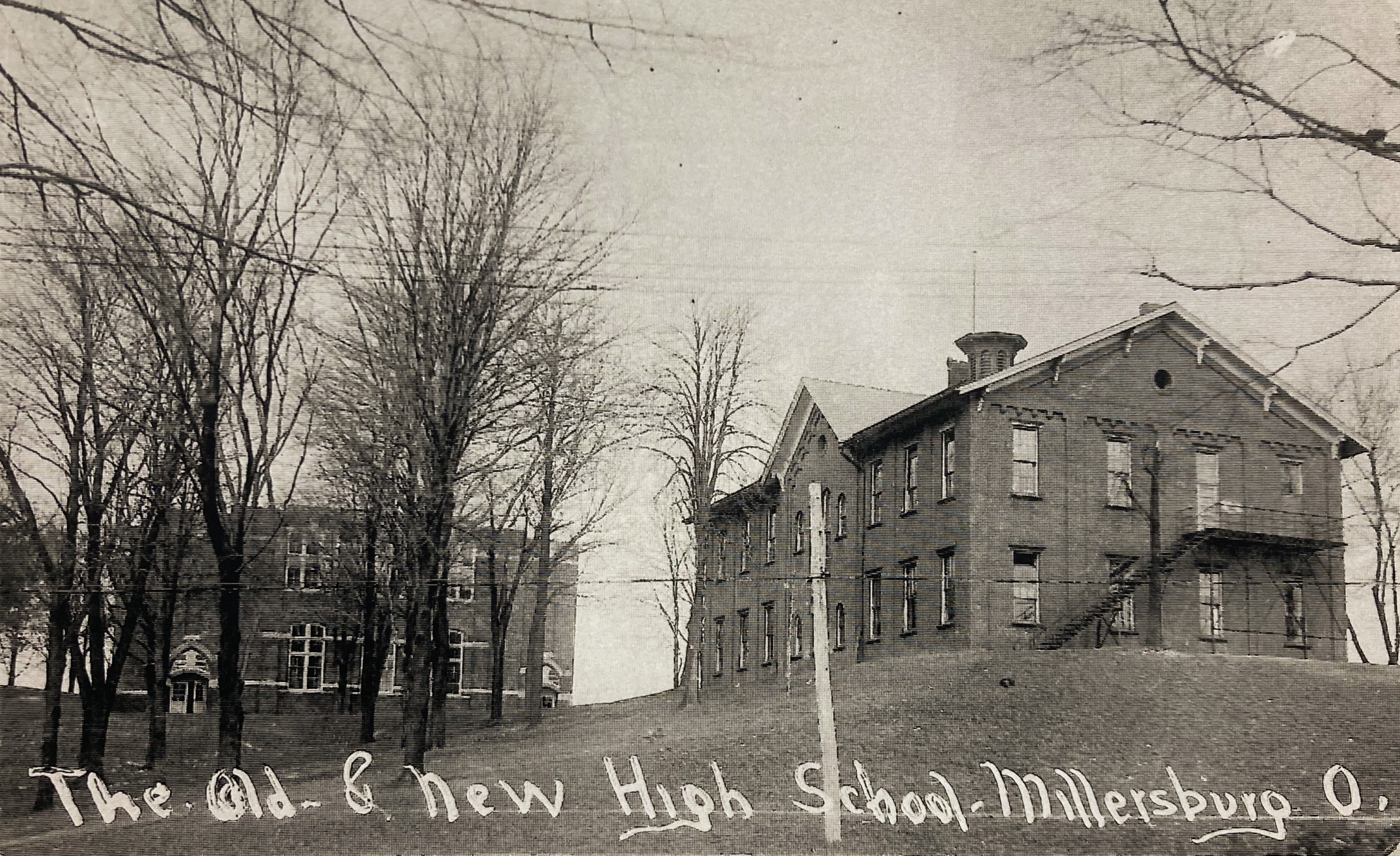 Millersburg: High school, on the left. 430 East Jackson Street. Built 1913/14. Designed by Packard. The old high school on the right (not a Packard design), built in 1866, was later razed.Photo credit: Holmes County District Public Library.