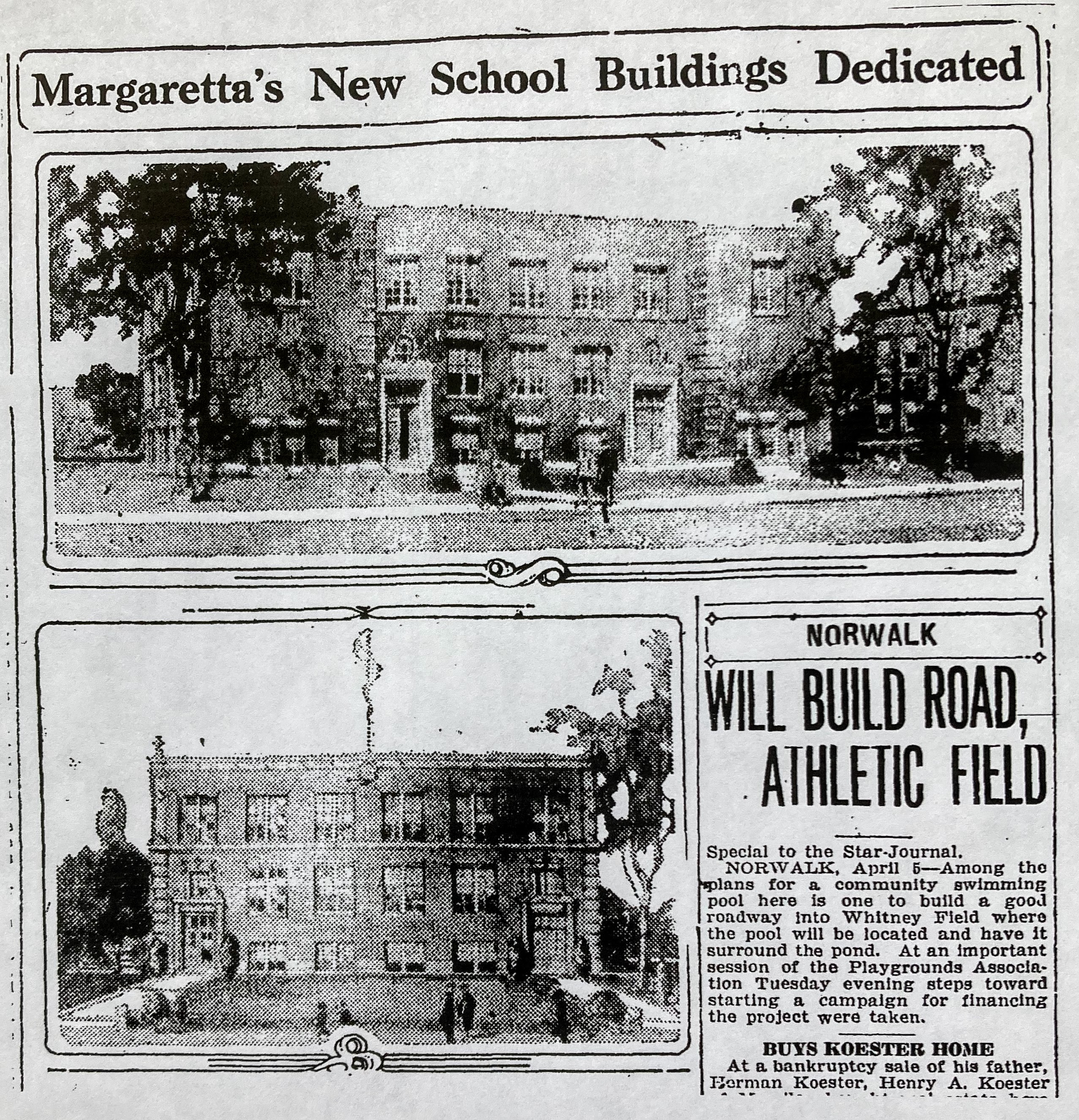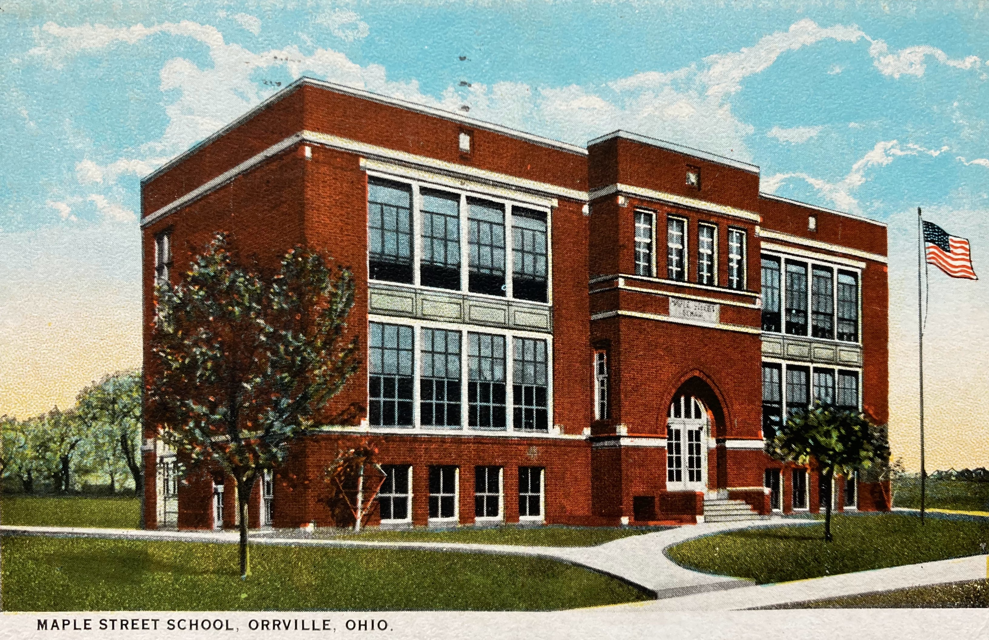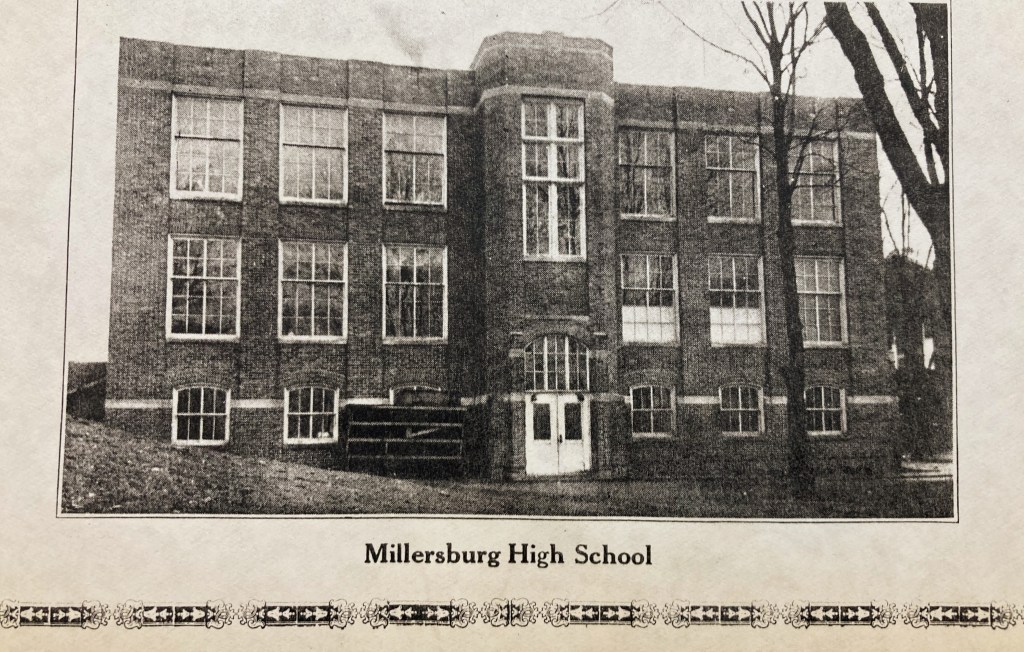 Millersburg: High school, on the left. 430 East Jackson Street. Built 1913/14. Designed by Packard. The old high school on the right (not a Packard design), built in 1866, was later razed.Photo credit: Holmes County District Public Library.