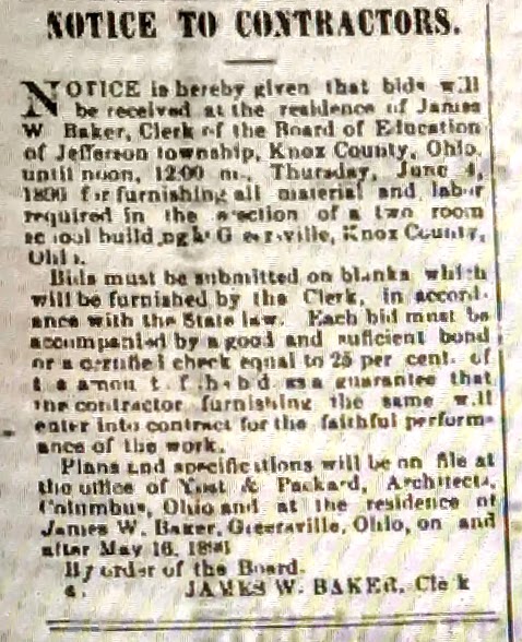 The school was located on the same road as the house at the back of this picture. See the map below, far left.Photo credit: David R. Greer, Knox County Agricultural Museum.Jackson Township School in Noble County. Rt 339 between Crooked Tree and Dungannon. Yost had several early 1880’s designs in Caldwell of Noble County including the public school. Perhaps this is his, too…it resembles the Greer school as compared below. Photo credit: SouthEast Ohio Pictures on Facebook.Martinsburg: public school. Built 1904. Designed by Packard.Hope to find a map to pinpoint the location. Packard was identified as the architect in The American School Board Journal of 1904, volume 29.Razed.Mount Vernon: Fourth Ward School. 401 West Chestnut Street. Built 1892. Designed by Yost & Packard. Razed.Mount Vernon: First Ward School. 714 East Vine Street. Built 1907. Designed by Packard. Still in use with a large addition on one side. Hope to find an early picture of it. Today it is called East Elementary School.Mount Vernon: Knox County Mutual Insurance Company. 108 East High Street. Built between 1892 and 1897 per Sanborn Fire Insurance maps. Designed by Yost & Packard. Razed. On the lookout for a clearer picture. Photo credit above and below: Public Library of Mount Vernon & Knox County.Mount Vernon: Frank Letts and Millicent Greer Beam residence. 121 East High Street. Built 1901. Designed by Packard. Now houses Ariel Foundation. Millicent’s brother, Robert Matthew Greer, was Secretary/Treasurer of the Knox County Mutual Insurance Company shown in the previous set of pictures. It’s likely Millicent and Robert were related to the Greersof Greersville previously pictured.Photo credit above and below: Public Library of Mount Vernon & Knox County.Note the Beam house on the left.Photo credit: Public Library of Mount Vernon & Knox County.
