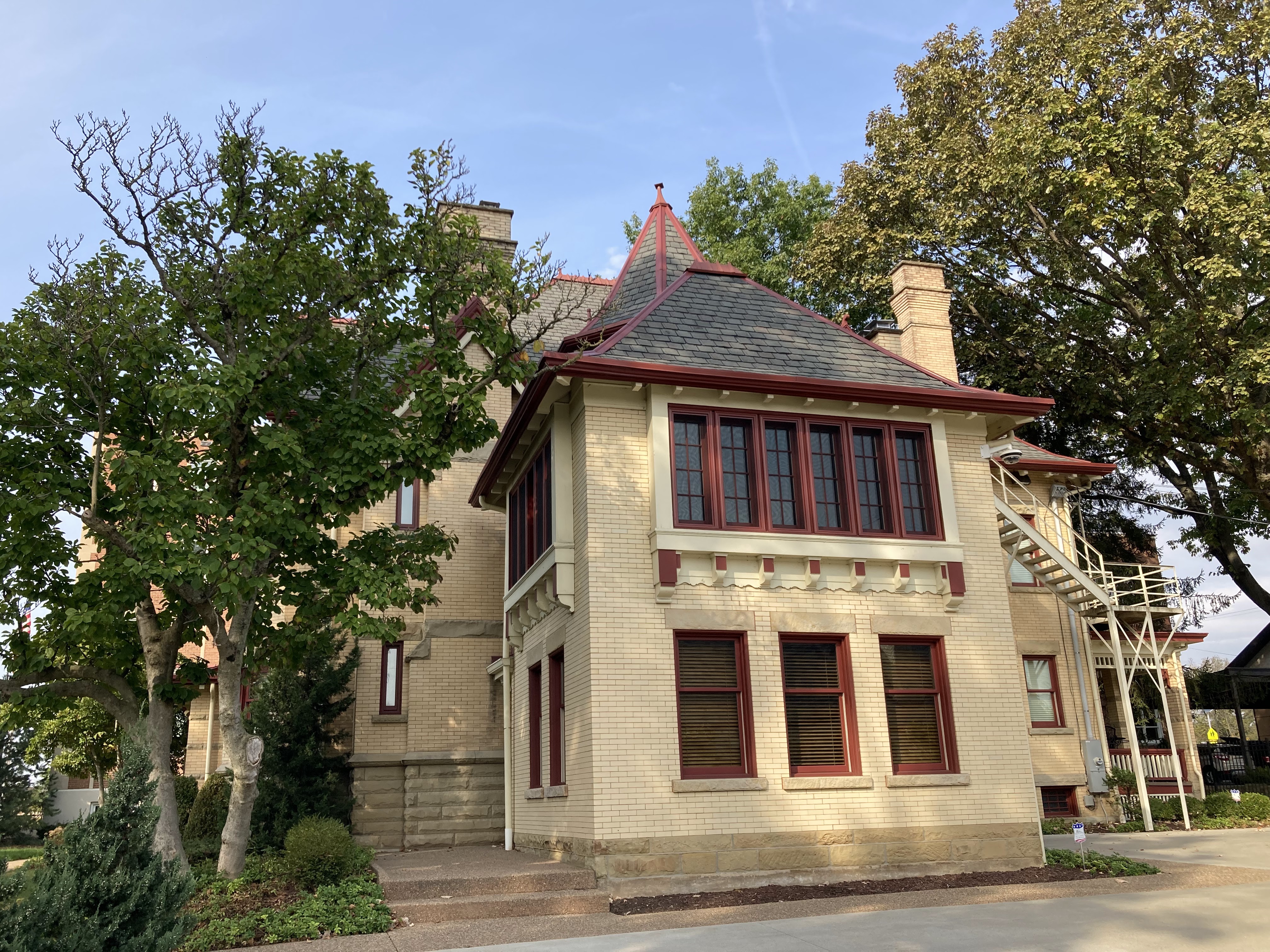 Philomathean Room after the spring 1891 remodel. The windows, entry doors, woodwork and ceiling have been preserved and remain to this day. Edgar L. Weinland, Class of 1891, was president of the Philomathean Literary Society at that time. Only 4 years separated these two men in age, and it’s likely they became lifelong friends. Weinland was chair of the building committee for the Packard-designed Carnegie Library built in 1908 that now houses the Otterbein Office of Admission. Packard later designed Weinland’s cottage-style house south of the O.S.U. campus. Edgar was City Attorney for Columbus. Weinland Park, a neighborhood in the Short North, is named in his honor. Photo credit: Otterbein Archives.Yost & Packard donated to the fund-raising campaign for the building (8 lines up from the bottom right above). Their gift and that of David L. Rike, both at $250 each, were the largest received. Photo credit: January 1893 issue of the Otterbein Aegis, Otterbein Digital Commons.One of Frank Packard’s best known Columbus designs is “the circus house” at 755 Dennison Avenue across from Goodale Park in the Short North. It was built in 1895 for Peter and Mary Sells. Today’s look is minus the dormers and other architectural features.