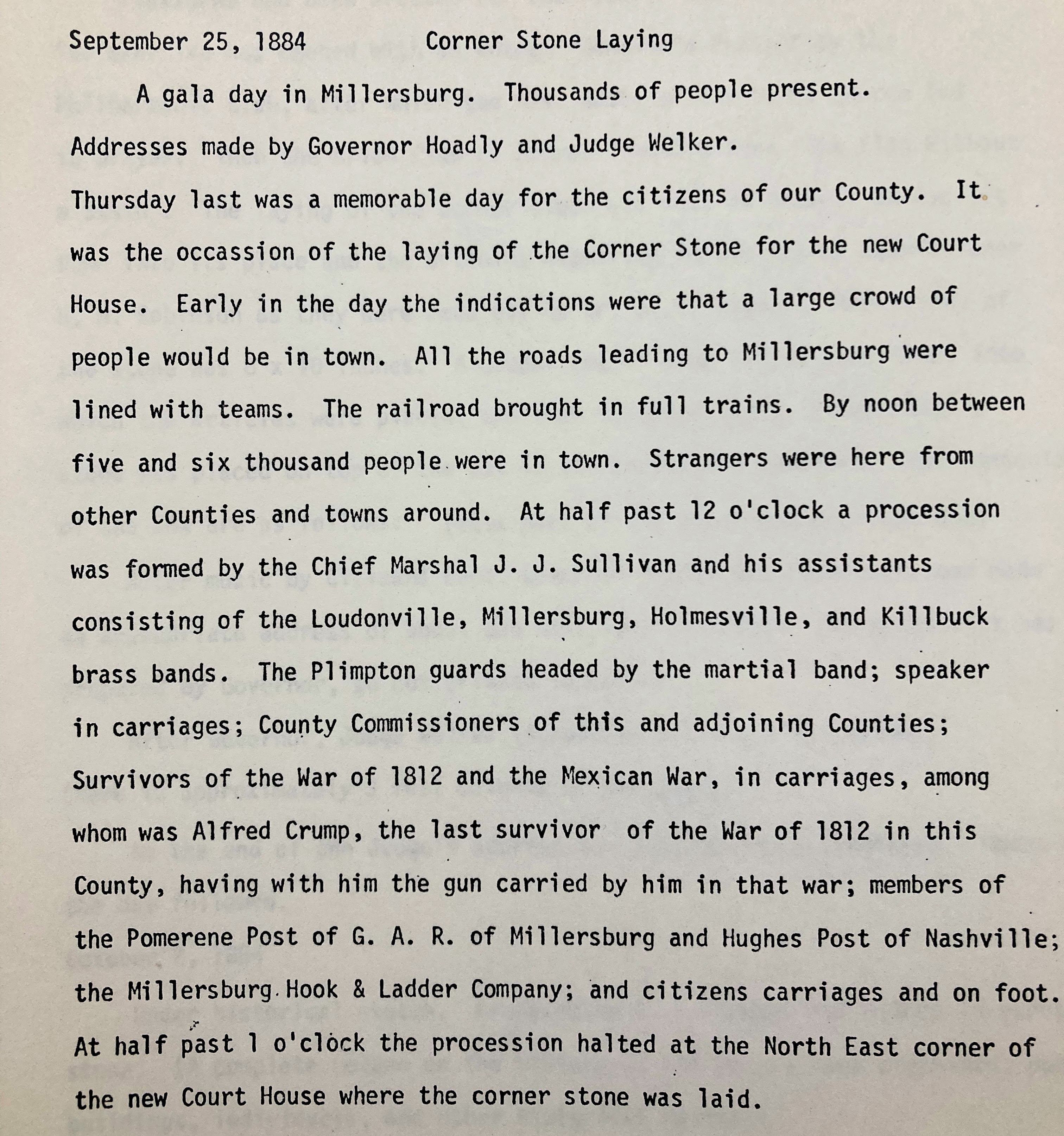 Today.Photo credit: Facebook.The courthouse shares the block with the old county jail which now houses government offices.Millersburg: City Hall. NE corner of East Jackson and North Monroe Streets. Built 1887. Designed by Yost. Razed.The Holmes County Farmer 3/31/1887.City Hall included an opera house.