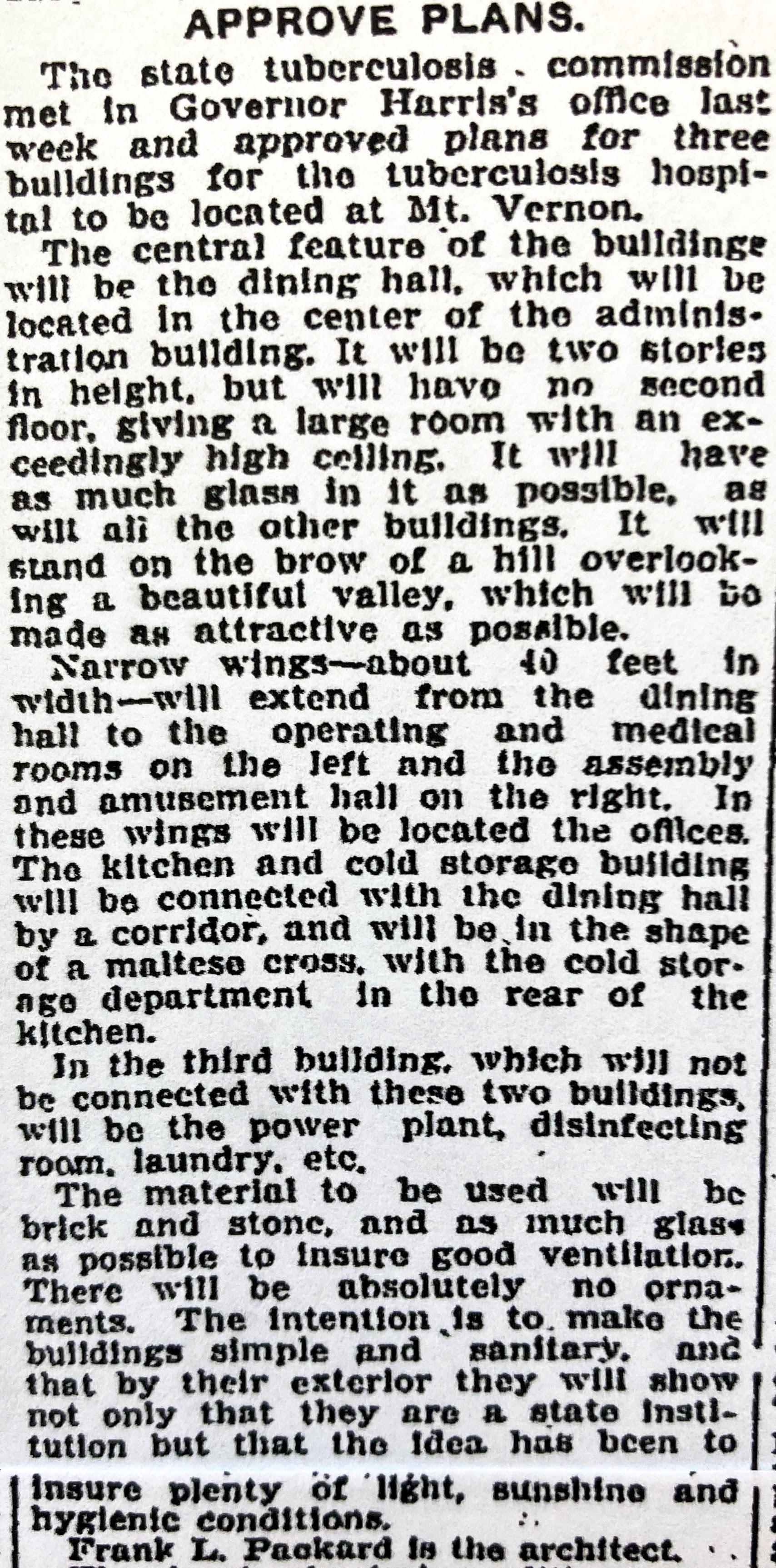 Mount Vernon: Ohio State Tuberculosis Sanitorium Administration Building and Dining Hall. 1250 Vernonview Drive. Built 1908/09. Designed by Packard.