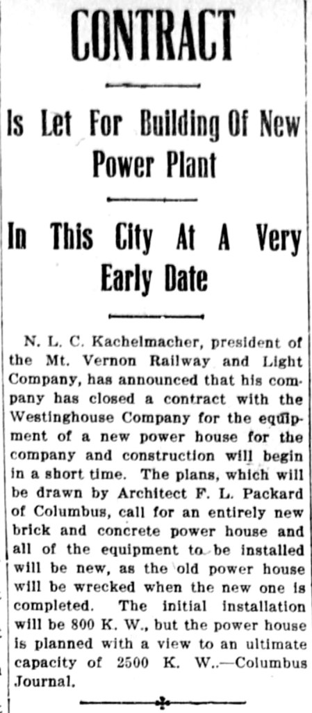Mount Vernon: Powerhouse for the Mt. Vernon Railway and Light Company. South Norton Street. The company was acquired by Nils Kachelmacher of Logan (OH) in 1910 when it was on the verge of bankruptcy. The powerhouse, designed by Packard, may have been an addition to an existing structure or may have been separate. Whether it was ever built is unknown. The streetcar line folded circa 1915.