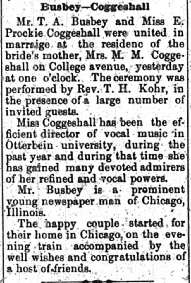 The 1880 U.S. Census listed Prockie and Hattie as assistants to their mother at the post office. In that capacity Prockie became connected to “Maxtown” as revealed further down in this blog. She was known in Westerville for her soprano singing voice. The unexpected death of Otterbein professor William Zuzerne Todd in August of 1887 led to her replacing him as vocal music instructor. At the close of the academic year in 1888, Prockie married Thomas Addison Busbey of South Vienna (Clark County), Ohio.