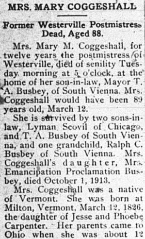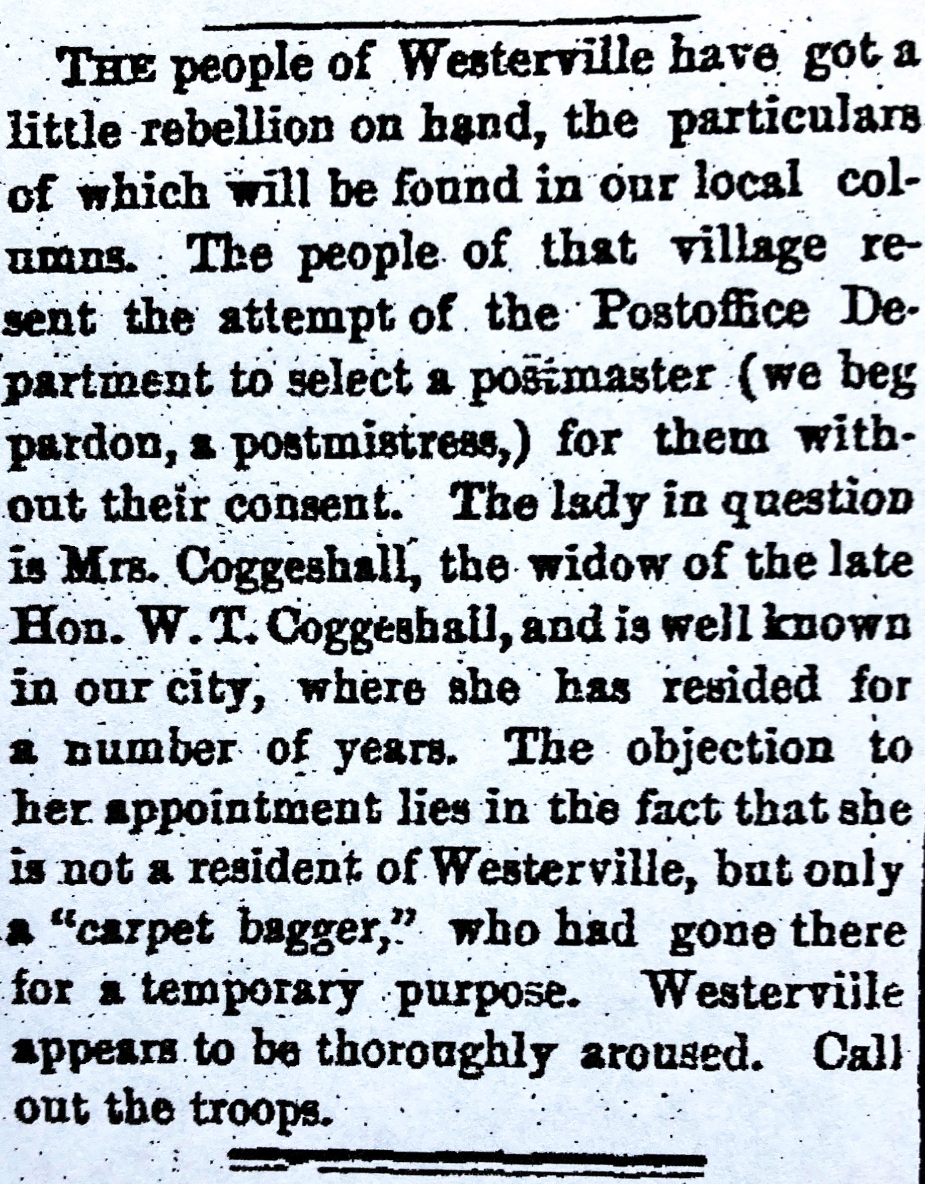 Mary’s appointment initially caused an uproar. She became very will liked in the village. The Columbus Dispatch 8/23/1877.