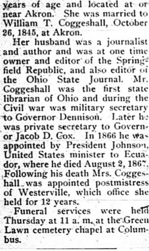 The Coggeshalls moved to Columbus in 1865 when William became editor of the Ohio State Journal (The Columbus Dispatch later succeeded it). He died of tuberculosis in Ecuador in 1867 a year and one day after being appointed U.S. Minister to that country. William’s decision to take the appointment was based on hope that the environment there might be a cure for the TB from which he was suffering. Mary and daughters Hattie and Prockie remained in Columbus after his death.