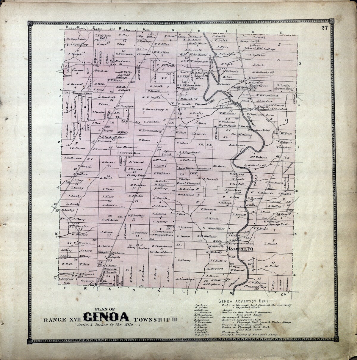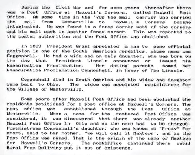 This is a page from the history of Genoa Township shown below. “Proxy” is not quite accurate.This is NOT the intoxcated mail carrier. 🙂 In 1941, Judge Emmett Melville Wickham, Sr (born in 1859) wrote his reflections of growing up in the area of Maxwell’s Corners. Judge Wickhan is interred at Oak Grove Cemetery in Delaware. Photo credit, left: Find-a-Grave. Photo credit, right: Ohio History Connection.Map is 1866. Note “MAXWELL PO” in bold print in the lower right-hand corner. The Maxwell post office existed from 1850-1871. It’s replacement, the Maxtown post office, existed from 1883-1901.This is also from Judge Wickham’s history.Today the area once referred to as Maxwell’s Corners is in the vicinity of this building…plus extending beyond it and now beneath Hoover Reservoir.