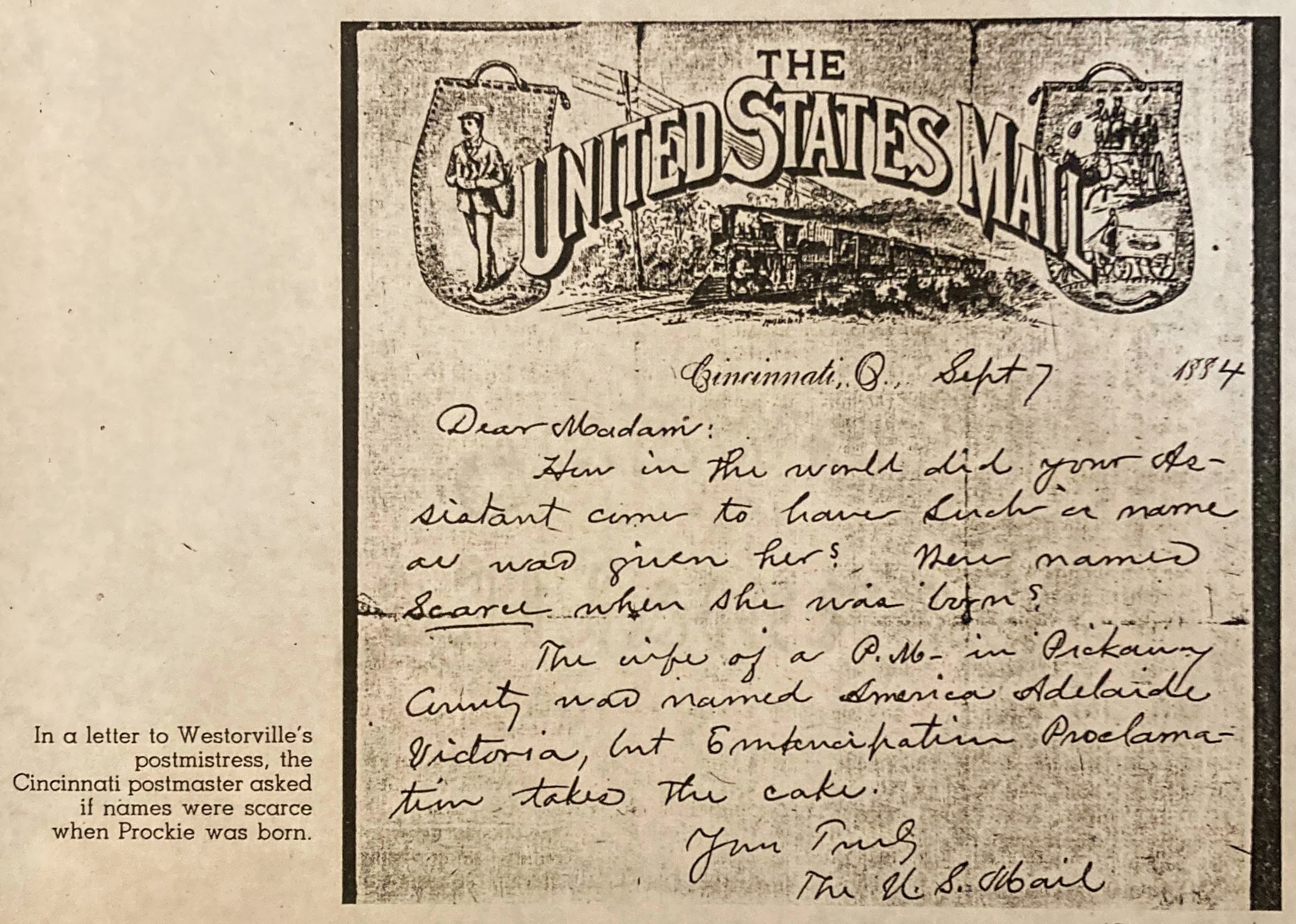 This humorous letter of 9/7/1884 from the Cincinnati post office to the Westerville post office reads: “Dear Madam: How in the world did your Assistant come to have such a name as was given her? Were names scarce when she was born? The wife of a P.M. in Pickaway County was named Adelaide Victoria, but Emancipation Proclamation takes the cake. Yours Truly, The U.S. Mail.” Photo credit: Westerville History Museum.