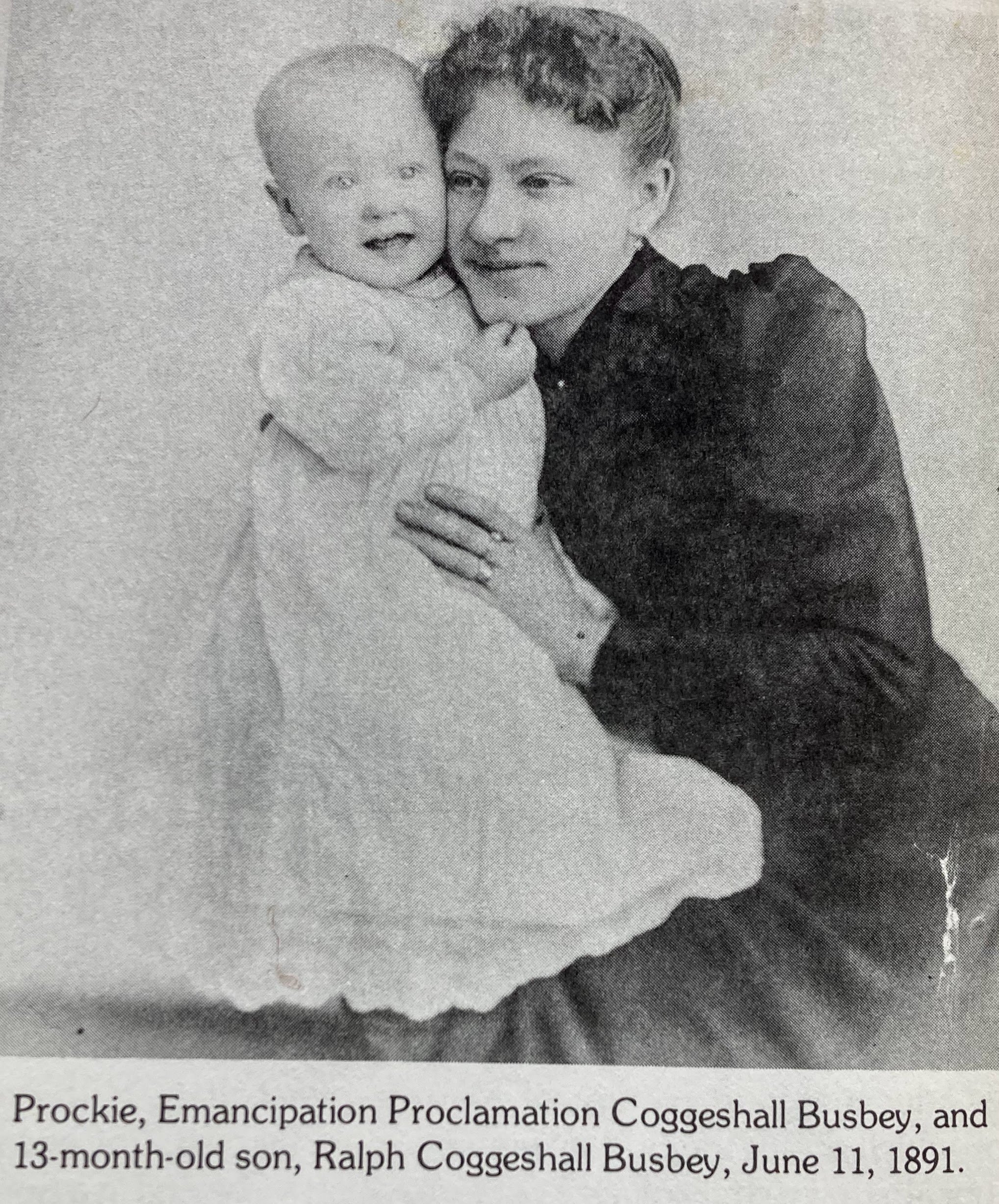 Photo credit above and below: the book Civil War Heroines, The Coggeshall Ladies. In this book, Prockie joked “Of course, my name is on Ralph’s birth certificate, all 40 letters of it–Emancipation Proclamation Coggeshall Busbey. It always made Ralph chuckle–and many other people, too.” Of her son’s middle name, she wrote “The Coggeshall was so that he would always know his heritage was from a famous diplomat, journalist and lecturer, my Father, Colonel William Turner Coggeshall.”