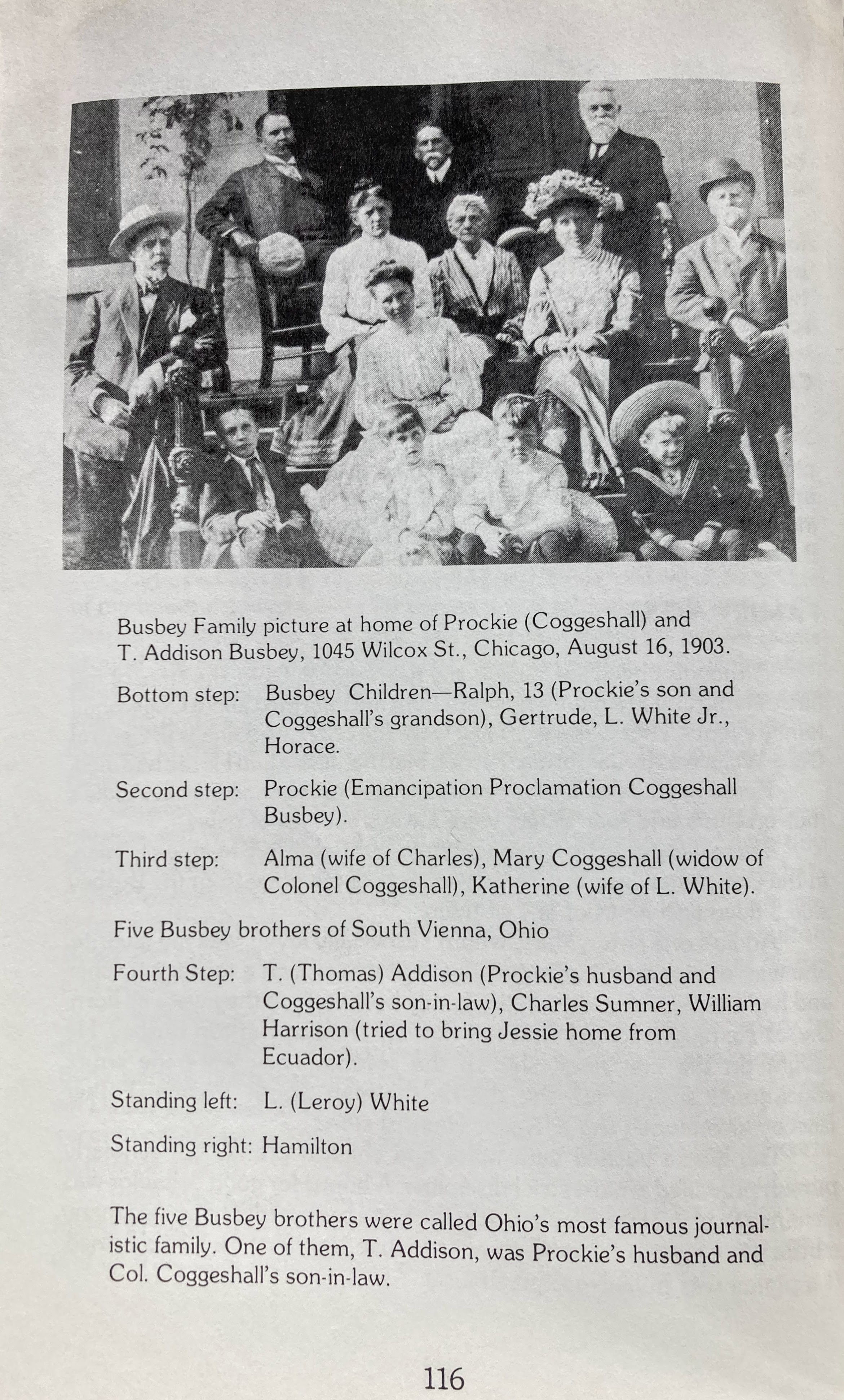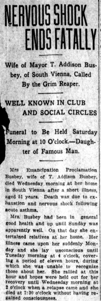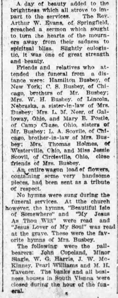 The Busbeys returned to Ohio and South Vienna in 1908. Addison had an insurance business, served four terms as South Vienna mayor and then became a State Senator. Ralph became a journalist/newspaper editor like his father. Prockie was in demand as a singer. “Everywhere I performed, whether at banquets, receptions, state functions, patriotic meetings or political rallies, I aroused great patriotic response because of my name, the diplomatic role my Father had, and because I ended my concerts with “The National Jubilee Song.”