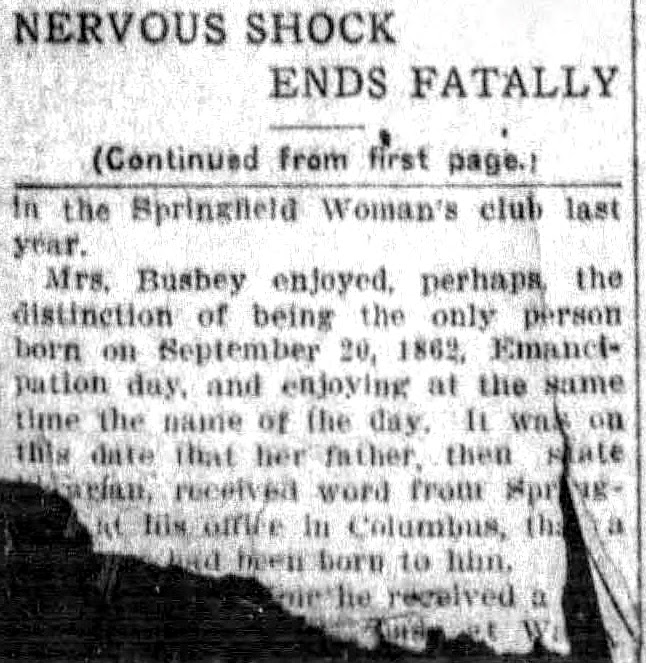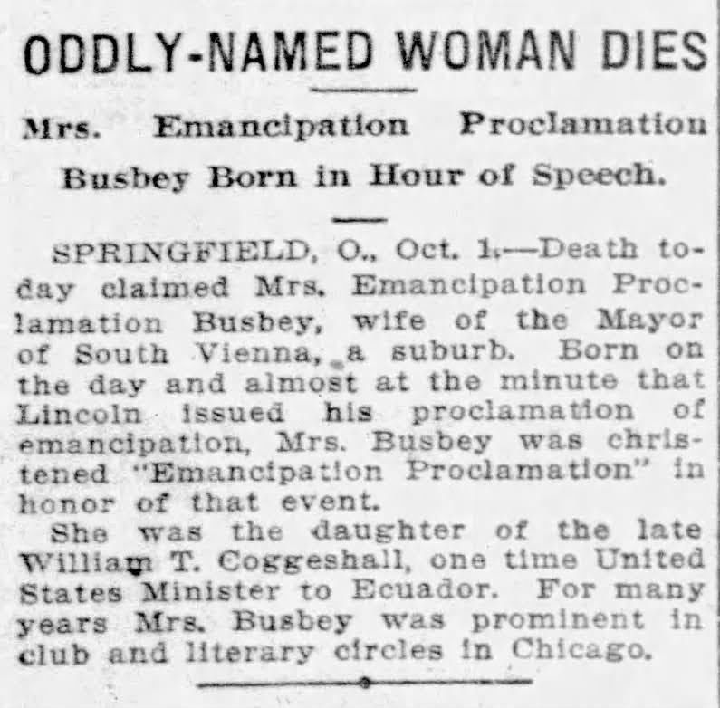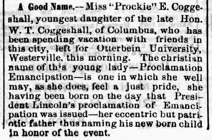 On September 20 of 1862, President Lincoln read to his Cabinet the final draft of his Emancipation Proclamation. It declared that effective January 1 of 1863 enslaved people in those states rebellious to the Union were forever free. At almost that very minute, a daughter was born to William and Mary Coggeshall of Springfield where William was owner/editor of the Springfield Republic newspaper. Secretary of the U.S. Treasury/former Ohio Governor Salmon P. Chase telegraphed Lincoln’s news to William who had served as secretary for Chase when he was governing Ohio. William, a staunch supporter of Lincoln, had a name in mind for the newborn to honor this occasion. He decided to withhold it until the Confederate capital of Richmond fell. When that happened two and a half years later in 1865…Emancipation Proclamation Coggeshall became official. As later stated by E.P. herself, “In those two-and-a-half years that I was nameless, what did the family call me? “Baby” and “Girlie.” Mama called me “Girlie” even into adulthood. Then, after I was christened Emancipation Proclamation they called me “Prockie.” So did everyone else, for the rest of my life.”