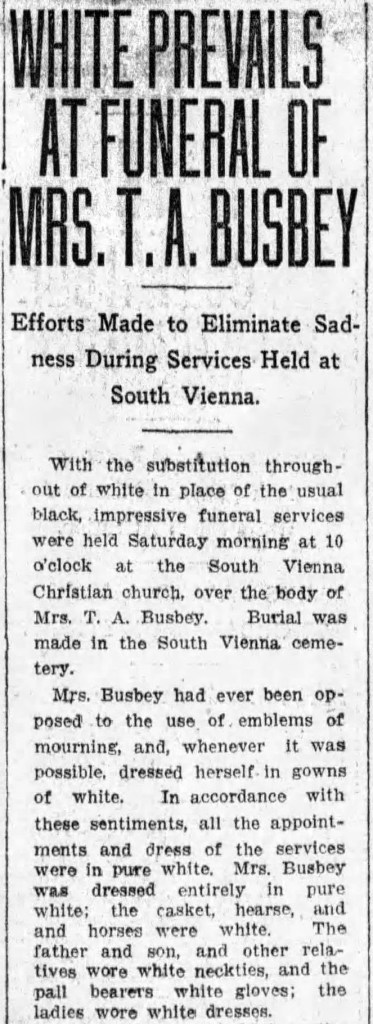 The Busbeys relocated to Thomas’ hometown of South Vienna (Clark County), Ohio, in 1908. They moved in with Prockie’s mother for whom they had purchased “a modest house” (per Prockie) on East Main Street. This is how it appears today and likely different from what it looked like in 1908.