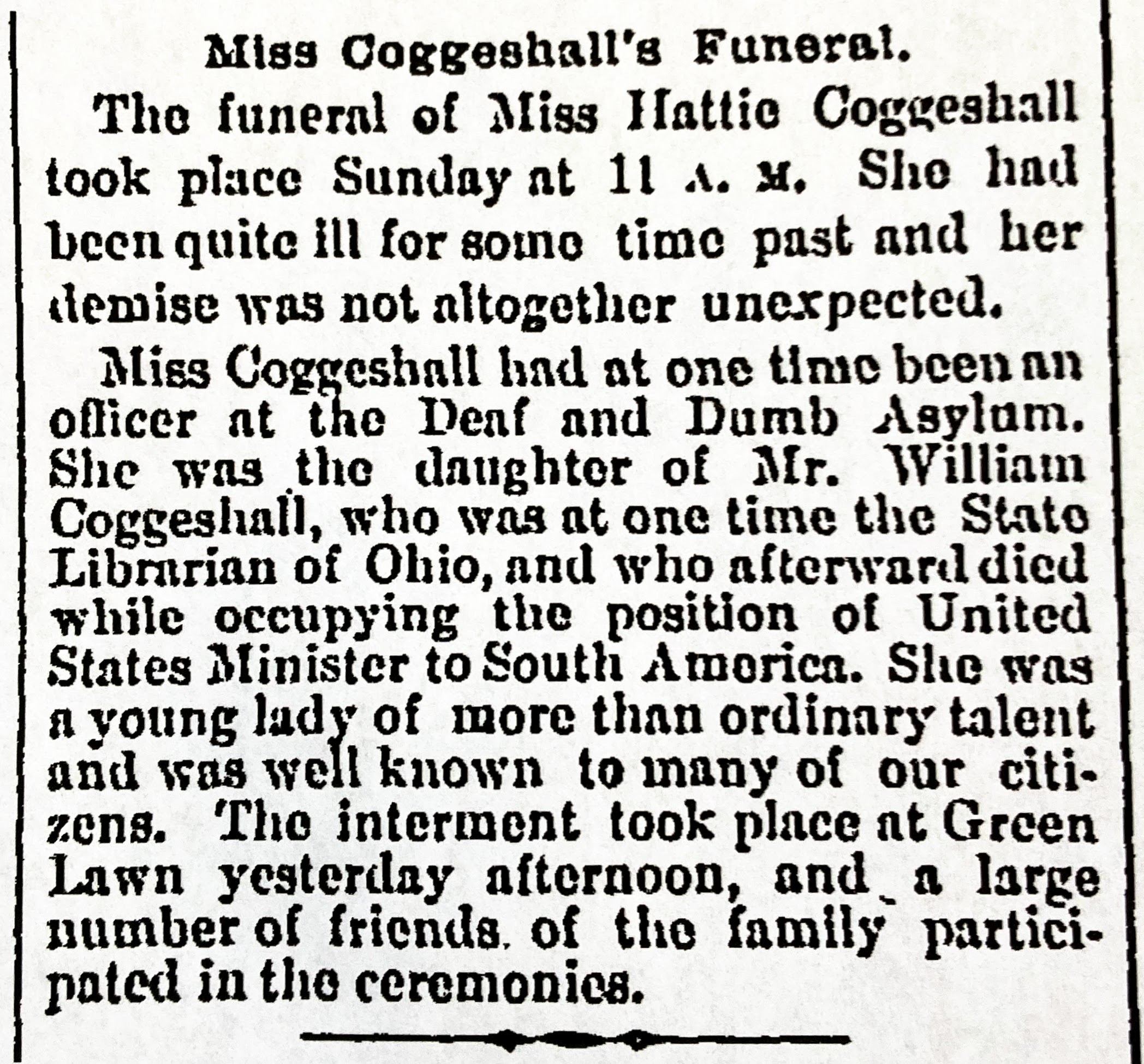 Hattie was listed as assistant to her mother in the 1880 U.S. Census. She must have moved back to Columbus sometime between then and her 1883 passing. The Columbus Dispatch 8/28/1883.