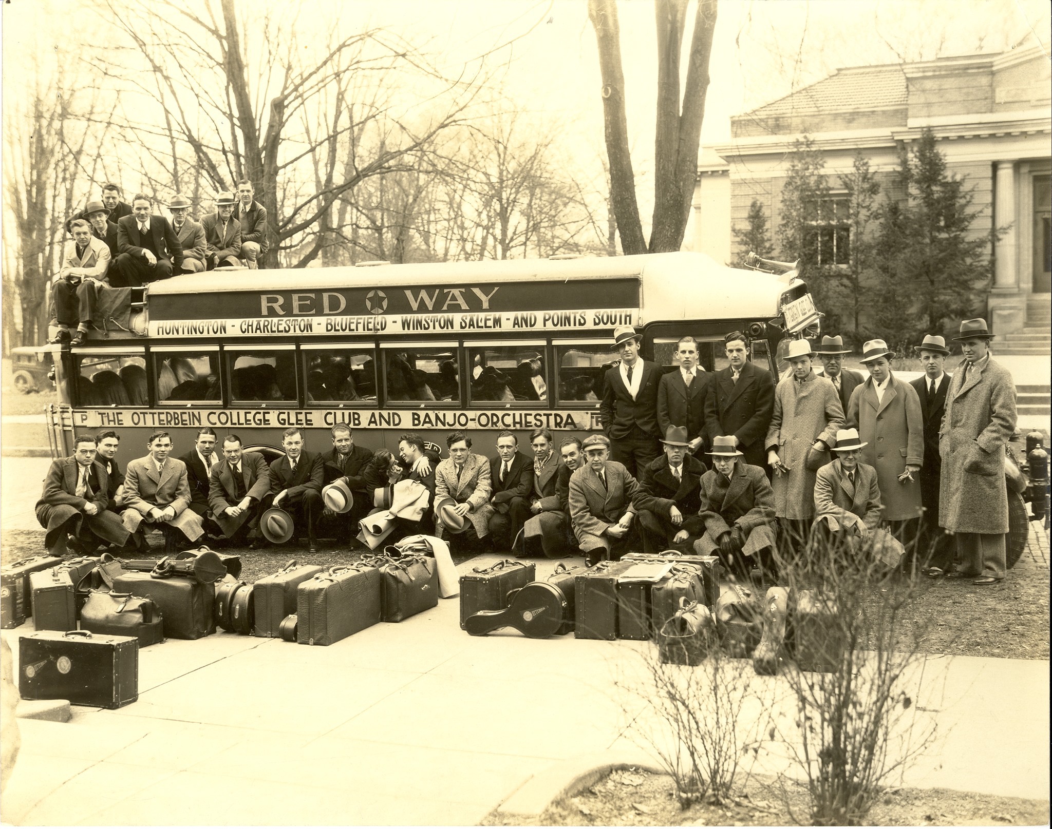 Westerville was the first community to be connected to an interurban line from Columbus. That was in 1895. The large interurban car barn, power station and depot in downtown Columbus are of the same architecture as Westerville’s interurban car barn above. It still stands at North State Street and Old County Line Road. My guess is Laurence designed it.Intercollegiate football was initially played behind Towers Hall. The Sosh building is on the right.Photo credit: Otterbein Archives.Physical Director Fouts may have dealt with ornery fellas like this at the Sosh. 🙂 This is a postcard that I think was taken in the block where Church of the Master UM and Clippinger Hall stand.50th Anniversary. Above picture on the right enlarged below. Photo credit: Otterbein Digital Commons.