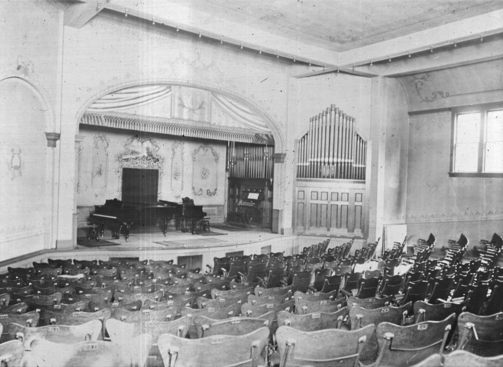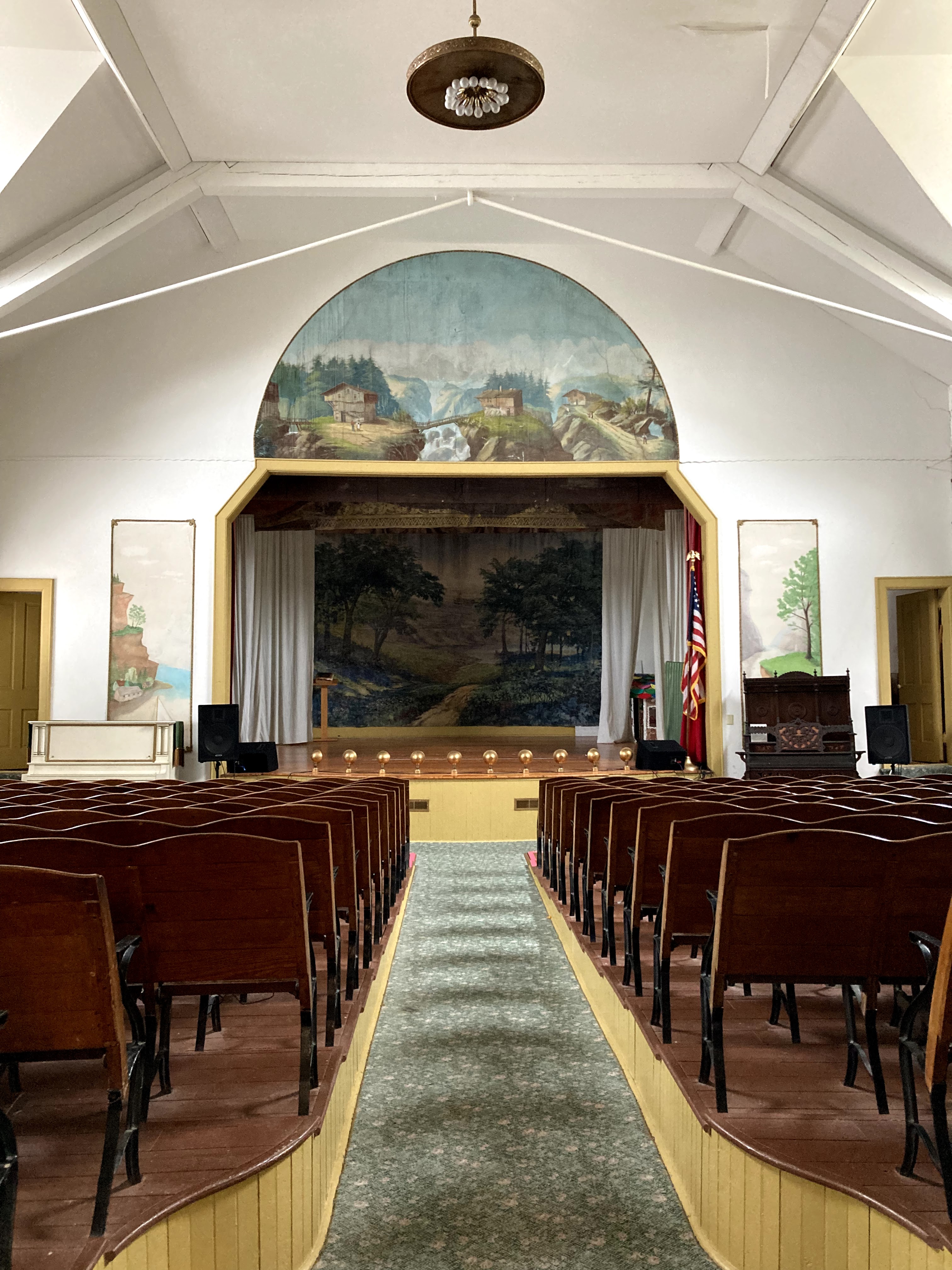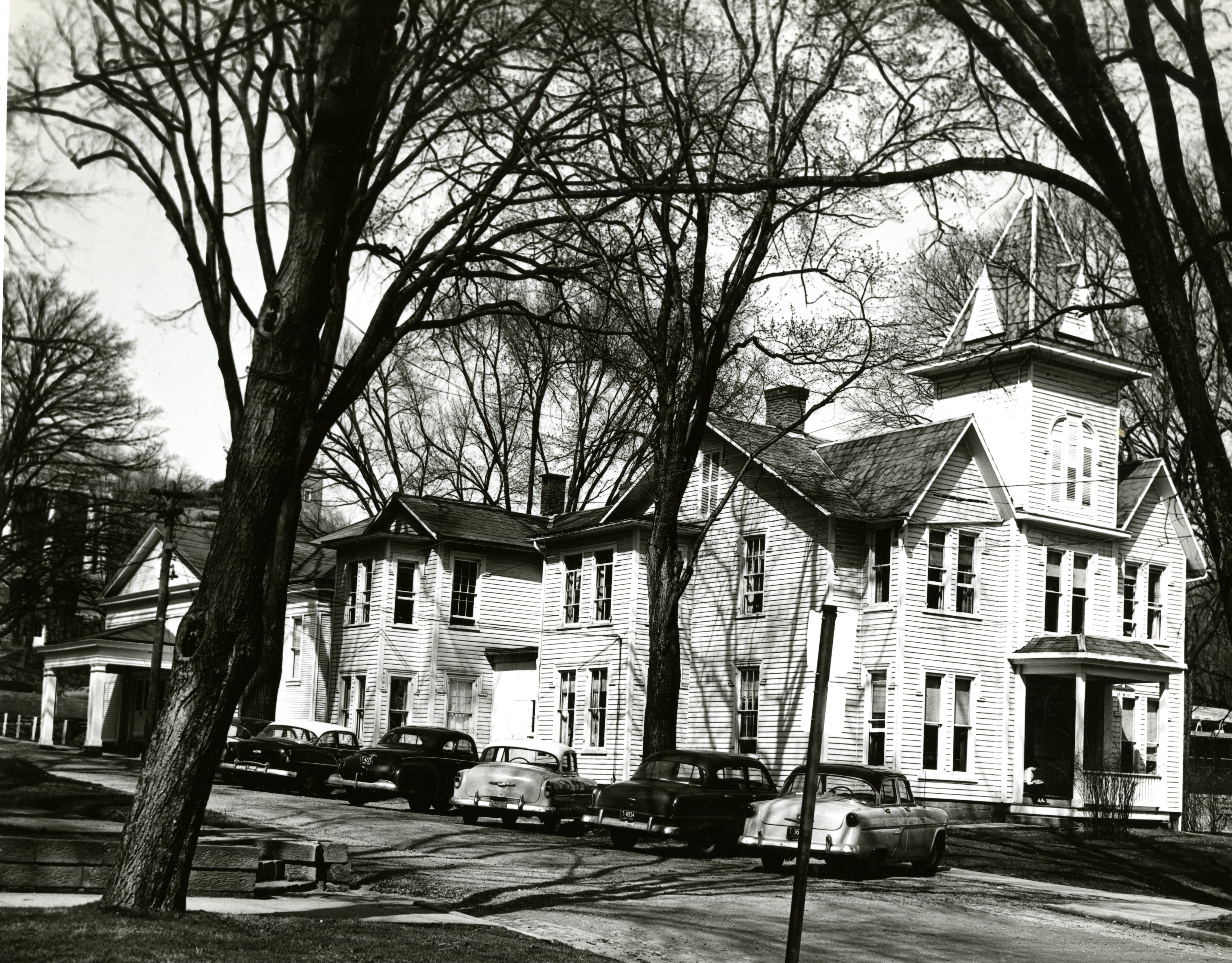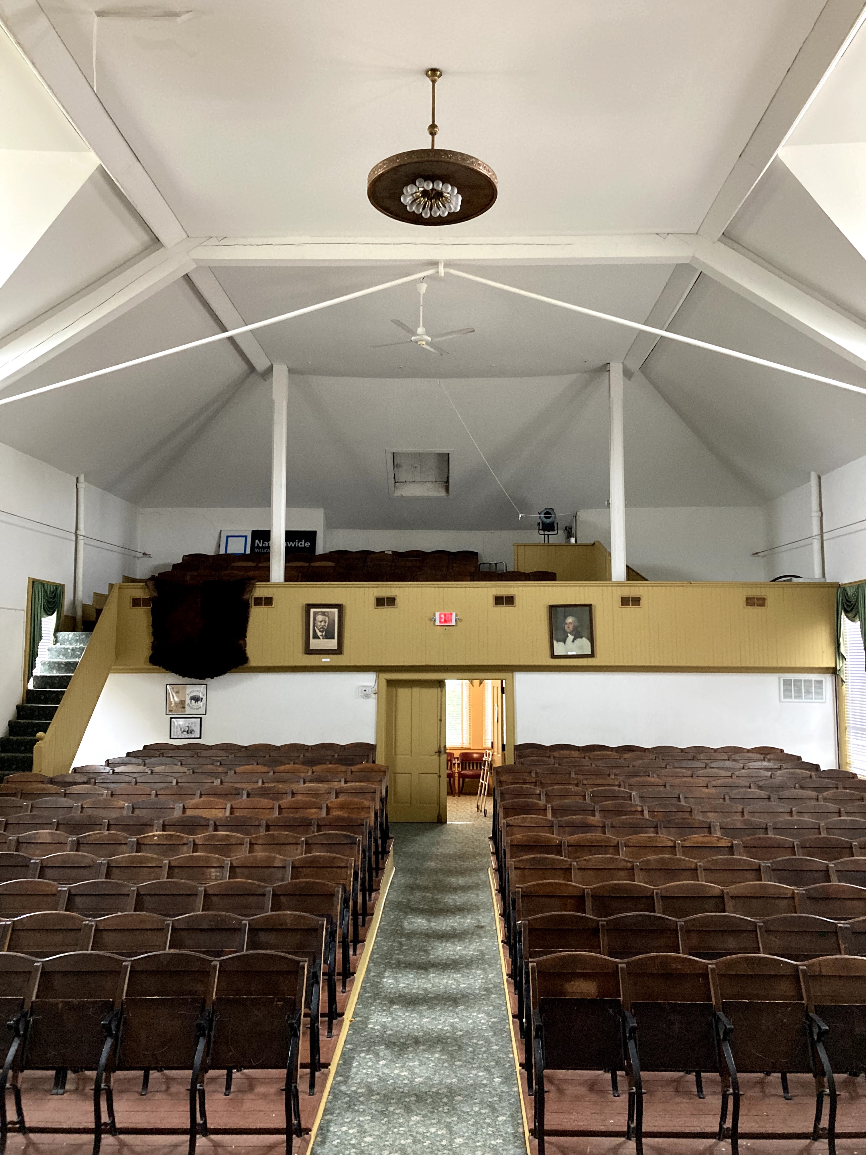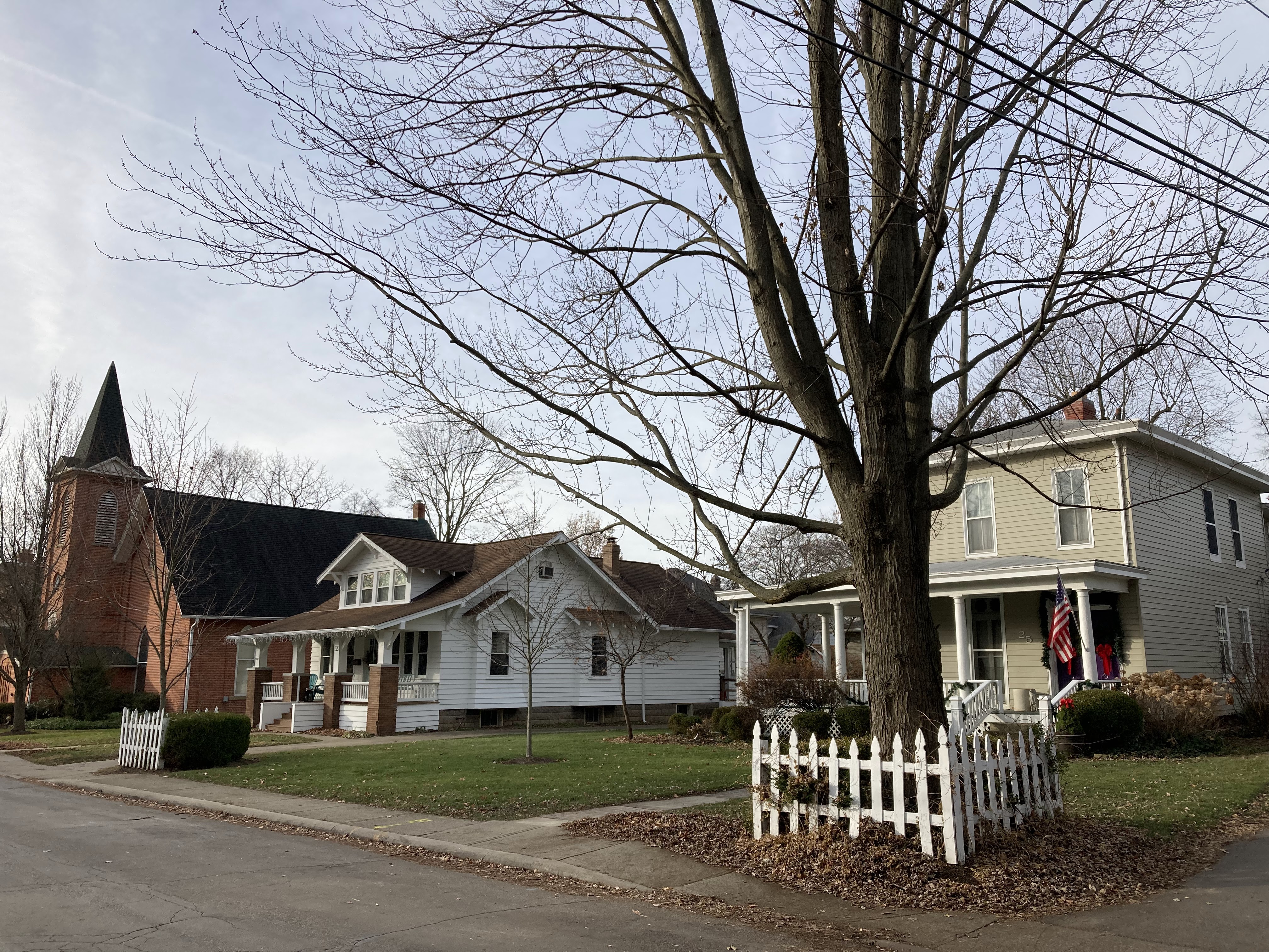 These two pictures, above and below, are interior views of the building after it was sold to the Blendon Grange. Note the exterior arched windows have squared off framing on the interior. The ceiling has decorative arches.Photo credit: Westerville History Center & Museum.Located just one block east of State Street in the Uptown. This shows Winter Street to the left of the church running west to City Hall, the tiny brick-red speck at the end of the picture.George and Lucinda Brewer who lived at 25 South Vine Street (tan house above) sold one of their adjoining lots to Samuel Rigal who donated it for construction of the church. The Brewer’s house was purchased in 1906 by First Presbyterian Church of Westerville and served as the parsonage until World War II. That piece of history appears to have become lost to all.