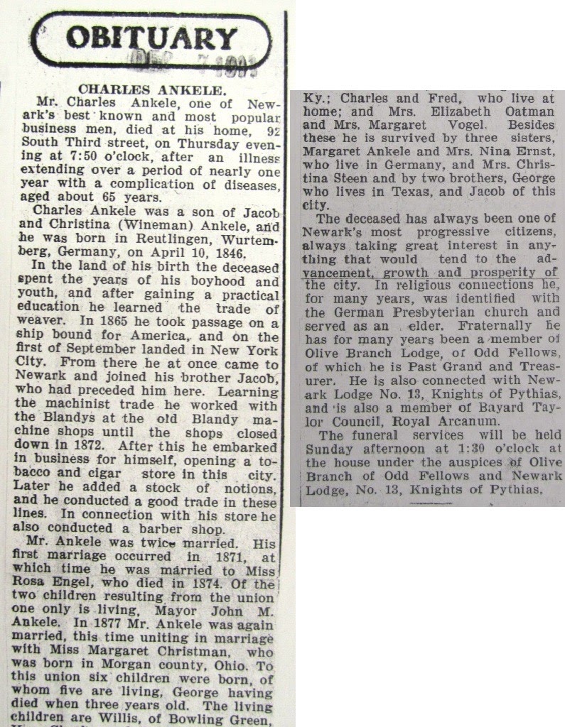 The Athens Messenger 11/24/1939. Charles’ wife Harriet died in 1896, likely from giving birth to a daughter a month previously…who was named Harriet. An obituary for Harriet could not be found.