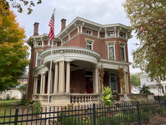 Evans Block to the left of the United Electric Co building. Photo credit: I believe this is from the Mike and Linda Perry collection.Above article from the Marion Daily Star of 8/1/1895. John Evans, above right, of John Evans Land & Realty Company and John Evans Lime & Stone Company.Marion: John and Mary Jane Owens Evans residence. 328 West Center Street. Built circa 1885-1890. Designed by Yost. Mary Jane was the daughter of John and Mary Belle Owens whose Yost-designed house is shown further down in this blog.Razed.The Evans residence later housed the local offices of The Standard Oil Company. Photo credit: Mike and Linda Perry collection.Marion: President Warren G. and First Lady Florence King Harding front porch above rebuilt in 1903 as shown below. 380 Mount Vernon Avenue. The First Lady and Jumbo are pictured in this photo from the archives of the Marion County Historical Society.Designed by Packard for Harding who campaigned for the presidency from his front porch to massive crowds. (The house itself is not a Yost & Packard design.)The Harding Home has been restored by the Ohio History Connection and is open for tours as is the Harding Presidential Center at the back of the property as shown below.The Harding Memorial is just minutes from the Harding home and is surrounded by a tremendous setting of open space and gravestones.