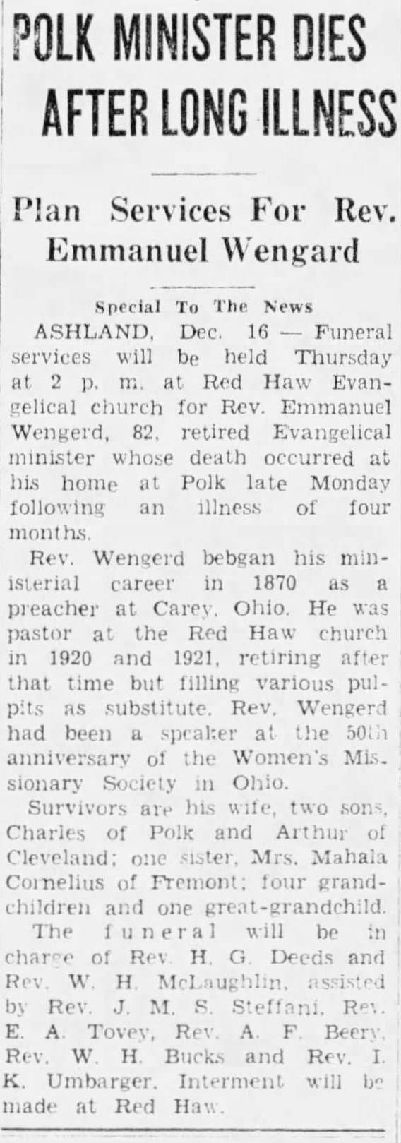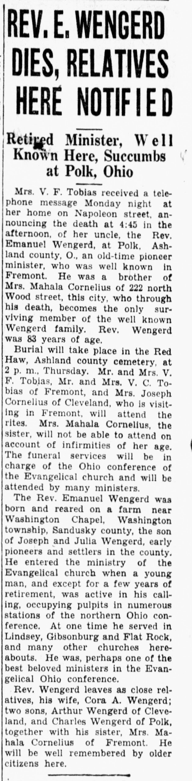 First pastor of Salem Evangelical Church. The misspellings shifted over from Rigal to Rev. Emanuel Wengerd. Note the misspelling of his first name below.The first time I ran across his last name it was spelled Wingard. Obituary from The News-Messenger (Fremont) 12/15/1931.