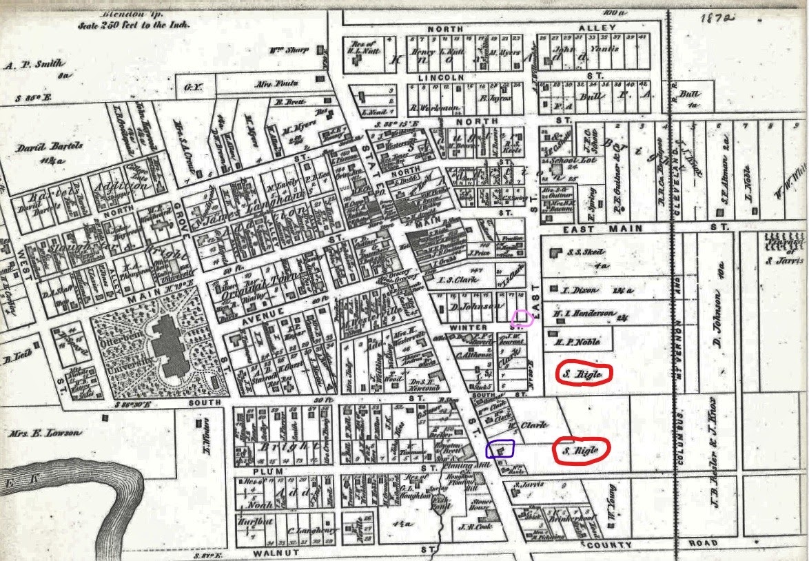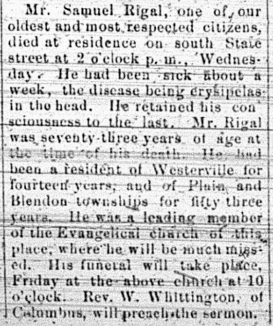The above two houses within a short distance of Salem Evangelical Church have a Samuel and Sara Rigal connection. The house on the left at the NW corner of Vine and College was likely built in 1895 by Ardillis D. Riggle, grandson of Samuel and Sara. The Westerville Public Opinion wedding announcement of Ardillis to Grace Shaff indicated they were moving into a “handsome new house” (highly likely 64 East College Avenue) “which the groom gave to the bride.” This house was later owned and lived in by Ardillis’ mother Sophia who was married to Daniel Rigal, son of Samuel and Sara. When Daniel passed away in 1872, Sophia Rigal married Issac B. Williams, a farmer in Plain Township. Sometime after his passing Sophia moved to Westerville. The house on the right at 53 South Vine Street was lived in by Noah Riggle. Noah was also a grandson of Samuel and Sara and son of Sophia and Daniel. Noah and wife Rebecca moved out of the house in 1898. It’s not known if they built the house.