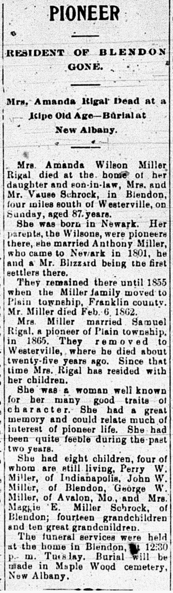 Per Amanda’s obituary in the Westerville Public Opinion of 9/1/1904, daughter Margaret (Maggie) Elizabeth Miller married into the Schrock family of Blendon Township. Schrock Road in Westerville is named for this family.