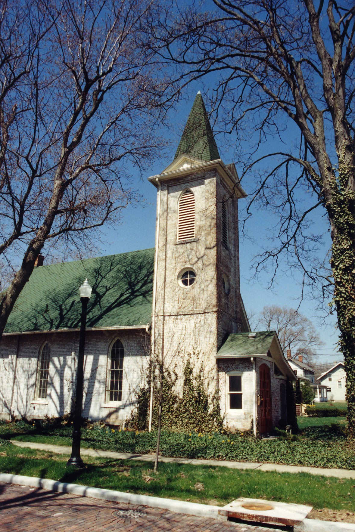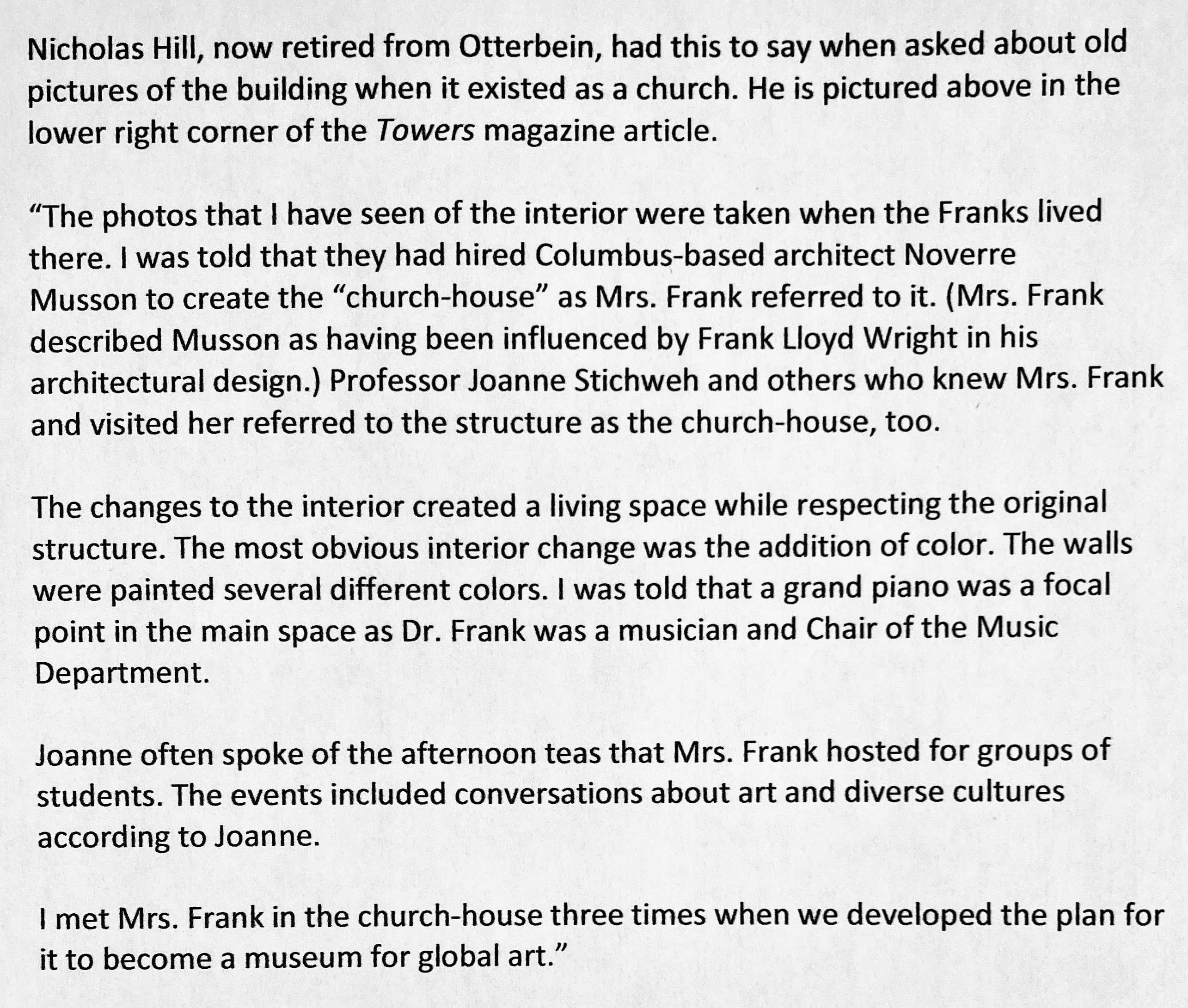 Bethel Church at Walnut Street & Harlem Road, Plain Township, just north of Westerville. Land was donated by Samuel and Sarah Hoy Rigal, and the building was dedicated 12/14/1850. From this church came charter members of the new Salem Evangelical Church built in Westerville in 1877 on Rigal-donated land.The above structure was abandoned in 1926.Razed. Photo credit: Archives of Ohio United Methodism at Ohio Wesleyan University.In a school located in this vicinity of South State Street, considered outside of Westerville at the time, Salem Evangelical Church was first organized in 1876.The church as it appeared in 1940. Photo credit: Archives of Ohio United Methodism, Ohio Wesleyan University.This photo was discovered after the blog was published. It shows the church without the small addition between the front entrance and window.The church at the top is the Methodist Episcopal Church on North State at West Home (replaced by Church of the Messiah United Methodist) and the church on the right is the Presbyterian Church on West College at South (replaced by First Presbyterian Church). Photo credit: 1906 Westerville Board of Trade publication, Otterbein University Archives.The church as it appeared when used as residence by Dr. and Mrs. Frank. Not sure when it was painted white…or whether by the church, the Grange which was the next owner or the Franks.Photo credit: personal collection of Bassem Bitar, City of Westerville Planning Manager.Salem Evangelical Church, 39 South Vine Street, Westerville. Today, the Frank Museum of Art, Otterbein University.