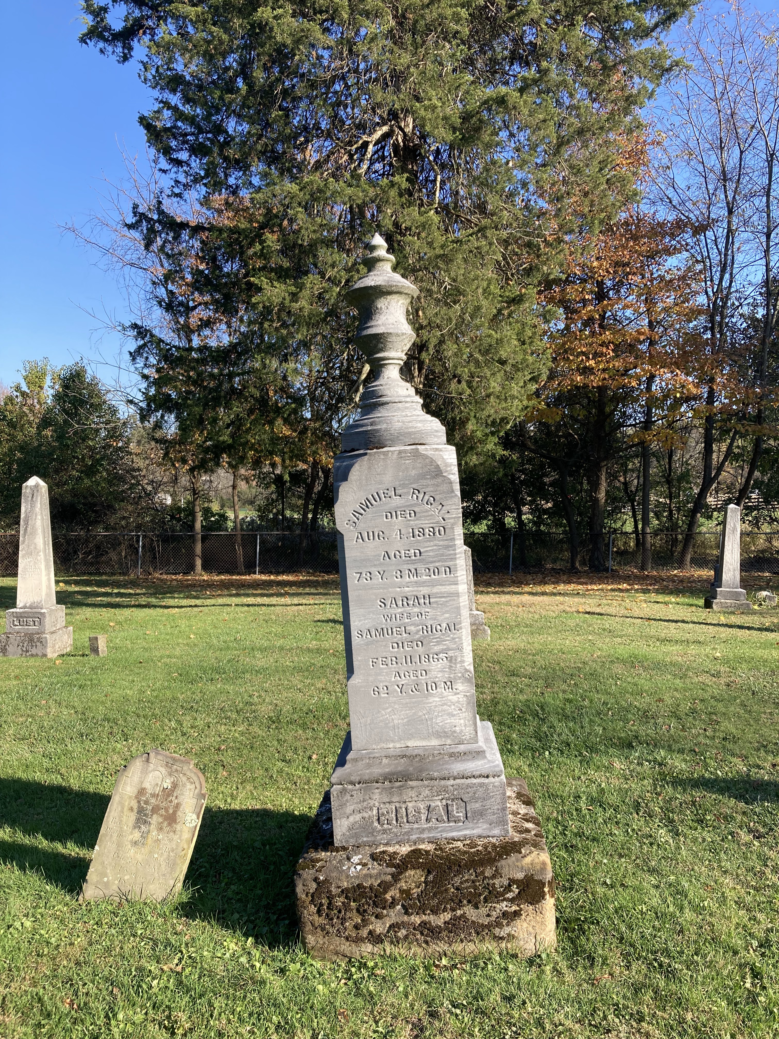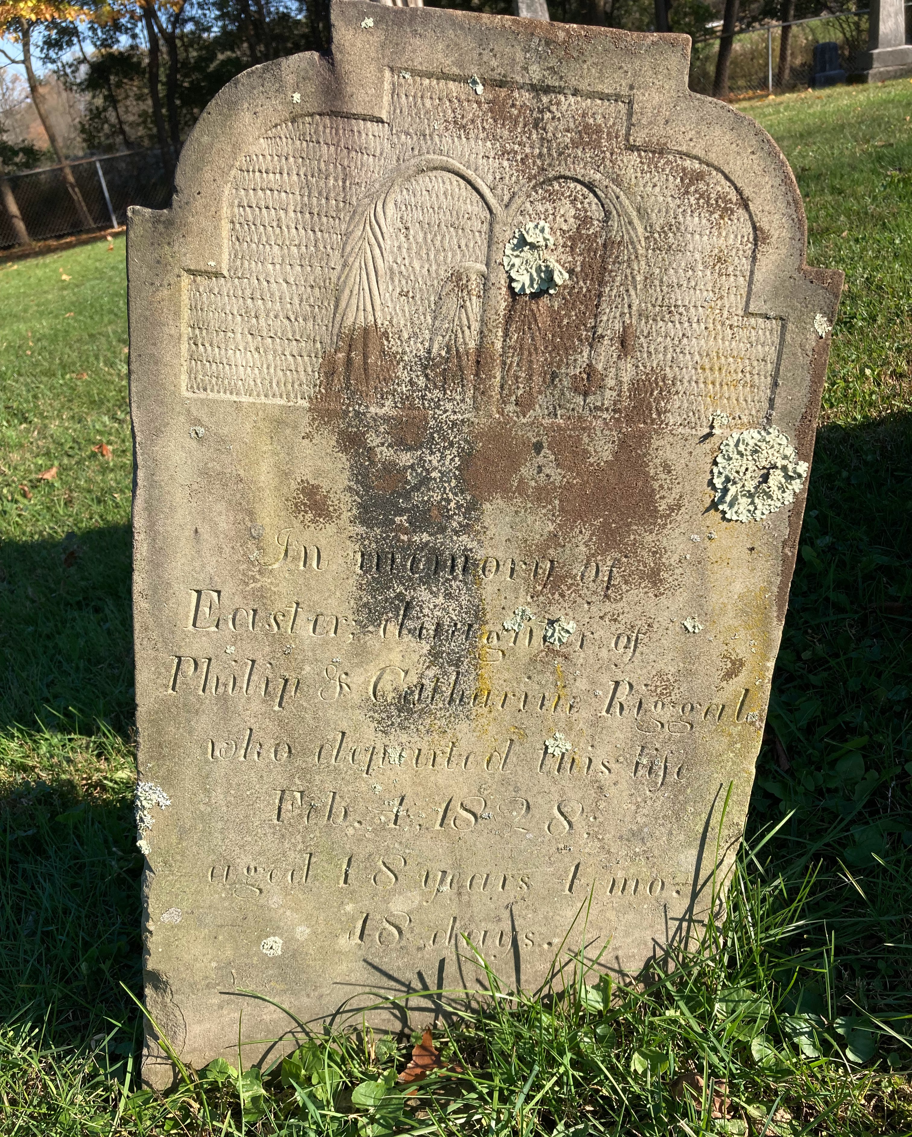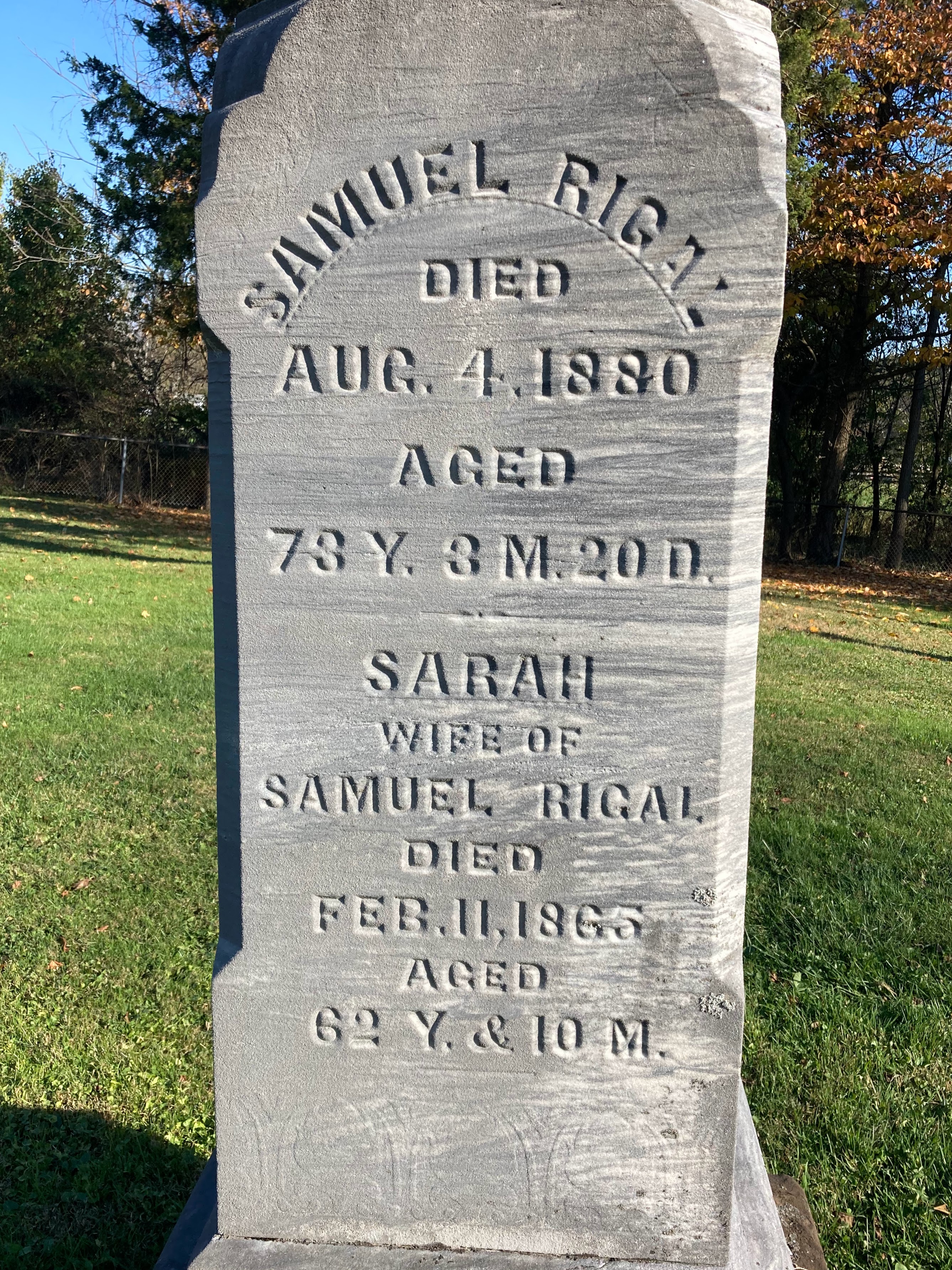Catherine Rigal’s inscription is on the reverse of son Samuel and daughter-in-law Sarah (Hoy). At the base and next to this monument is the hard-to-read gravestone of Easter, “daughter of Philip & Catherine Riggal.” I was unable to find any record of Philip, Samuel’s father. Samuel’s mother Catherine must have changed her last name from Riggal to Rigal.