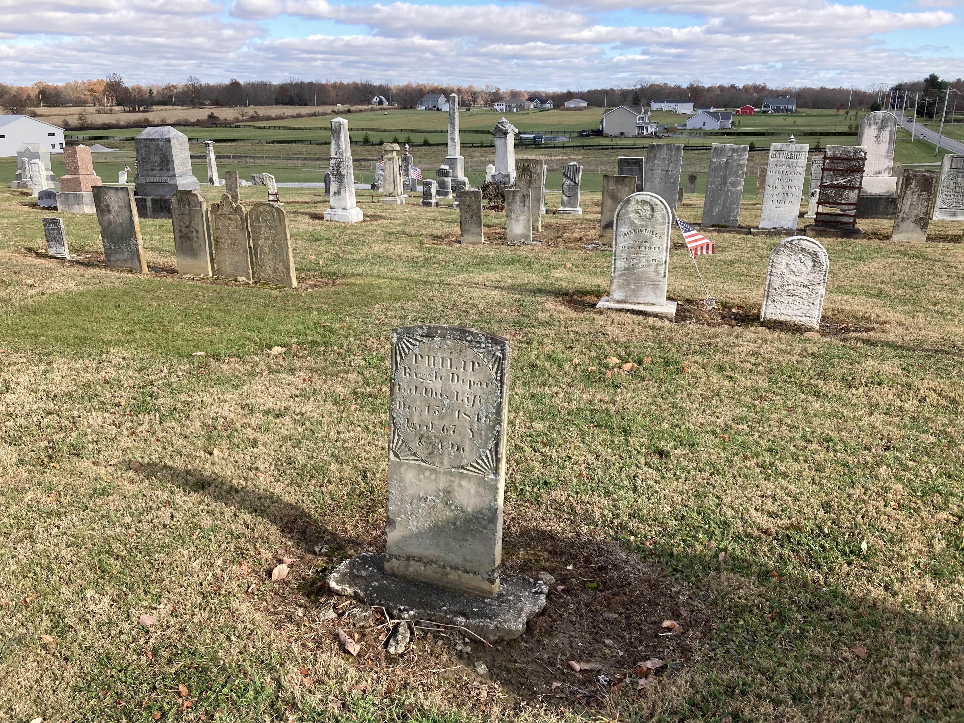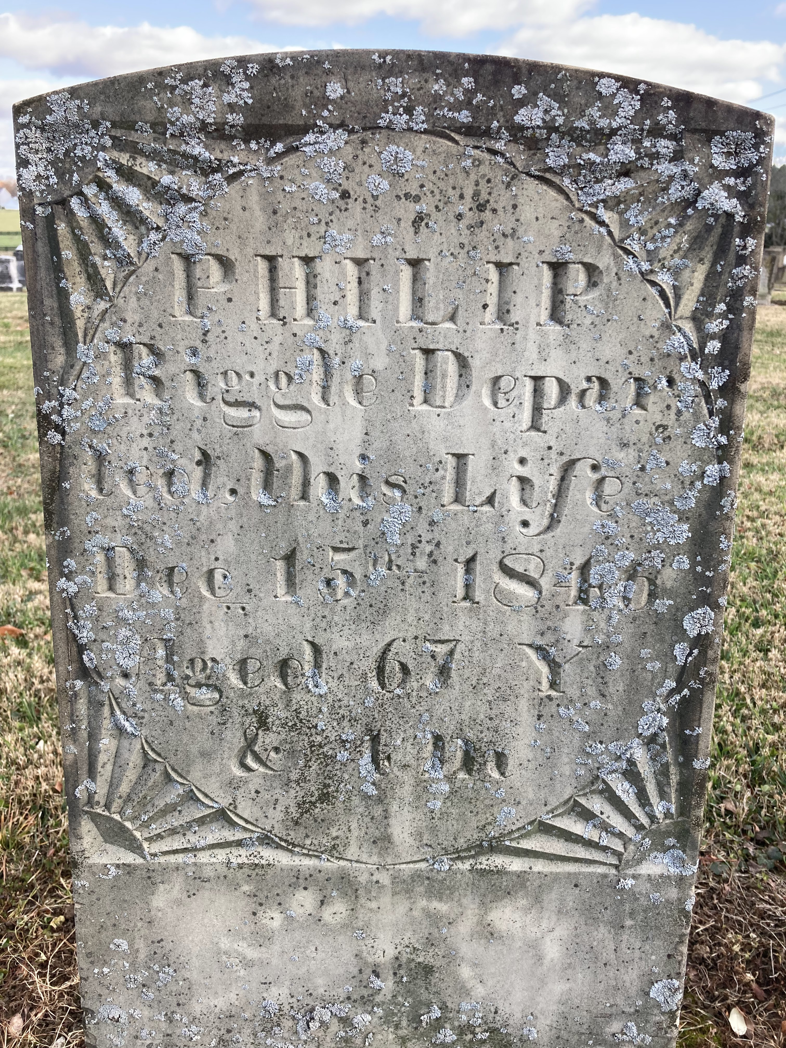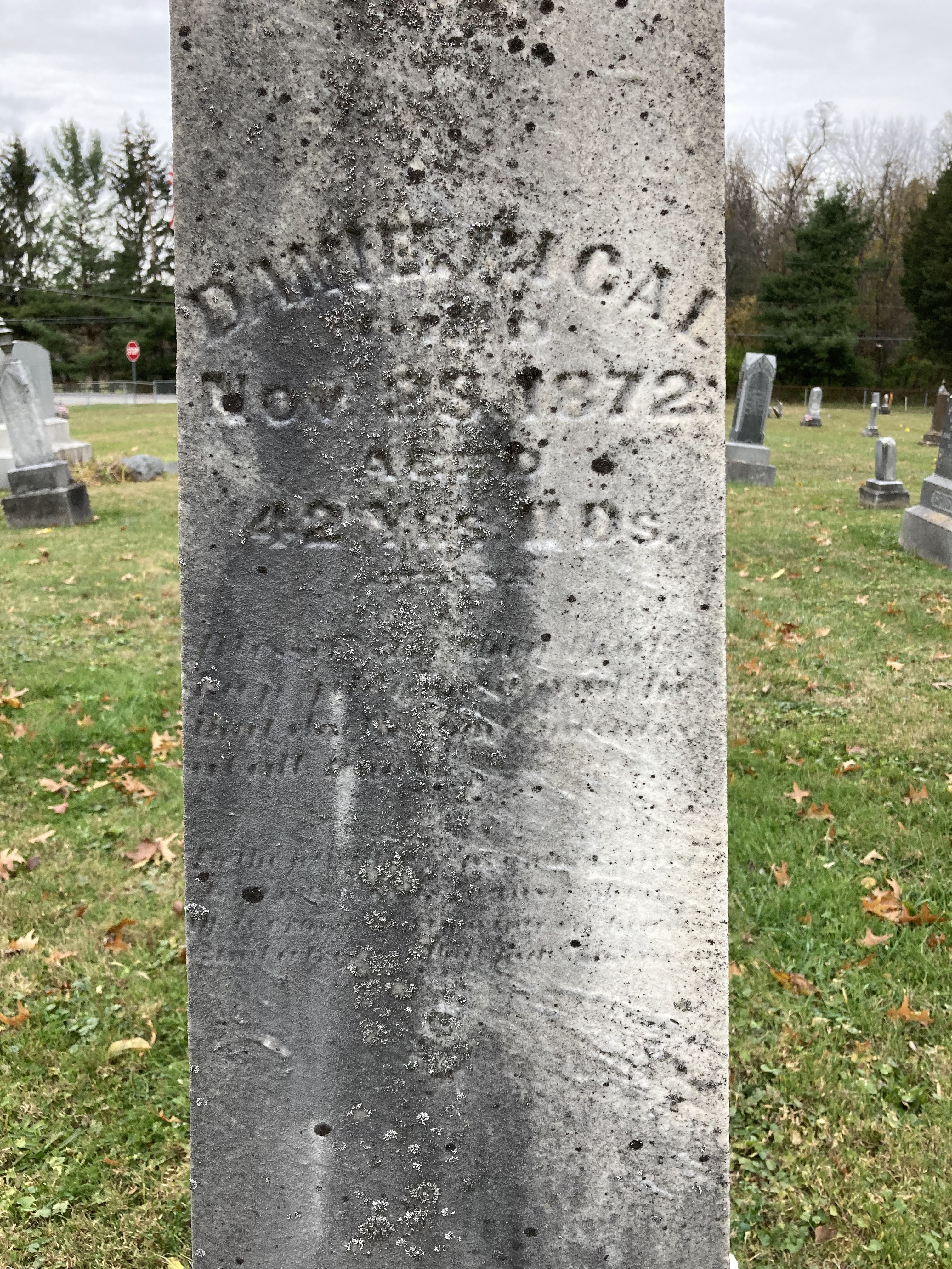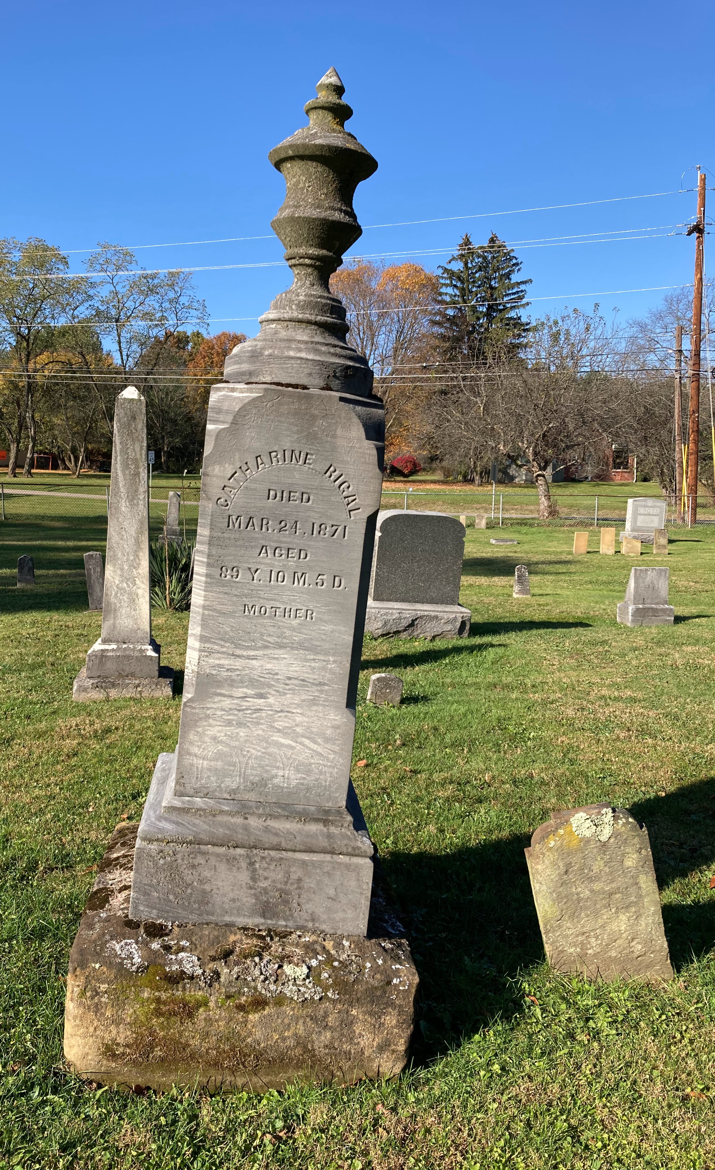 Catherine Rigal’s inscription is on the reverse of son Samuel and daughter-in-law Sarah (Hoy). At the base and next to this monument is the hard-to-read gravestone of Easter, “daughter of Philip & Catherine Riggal.” I was unable to find any record of Philip, Samuel’s father. Samuel’s mother Catherine must have changed her last name from Riggal to Rigal.