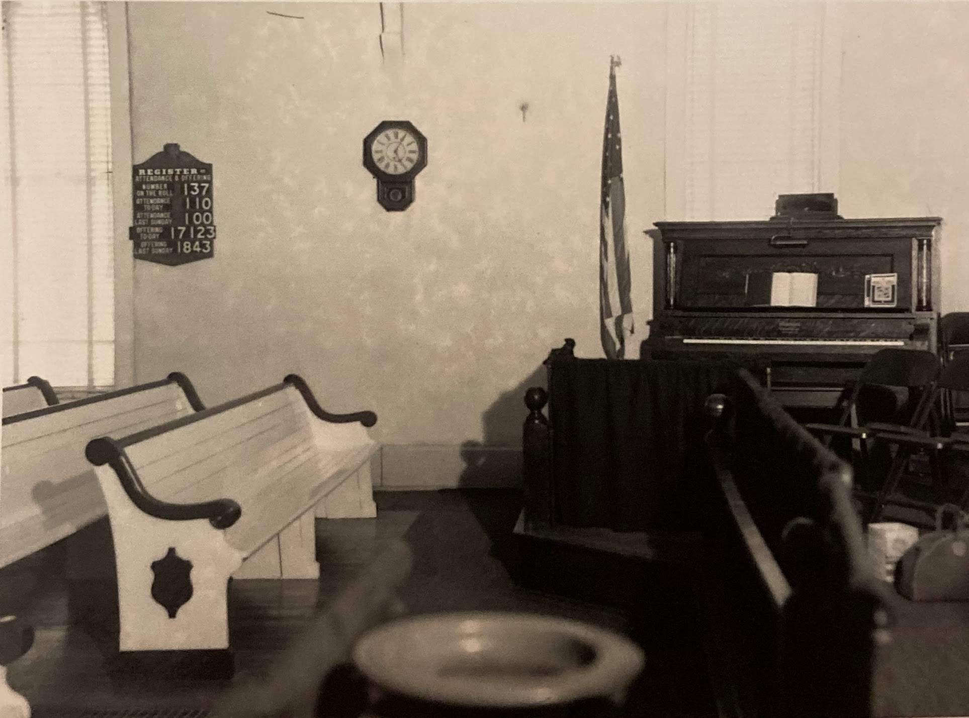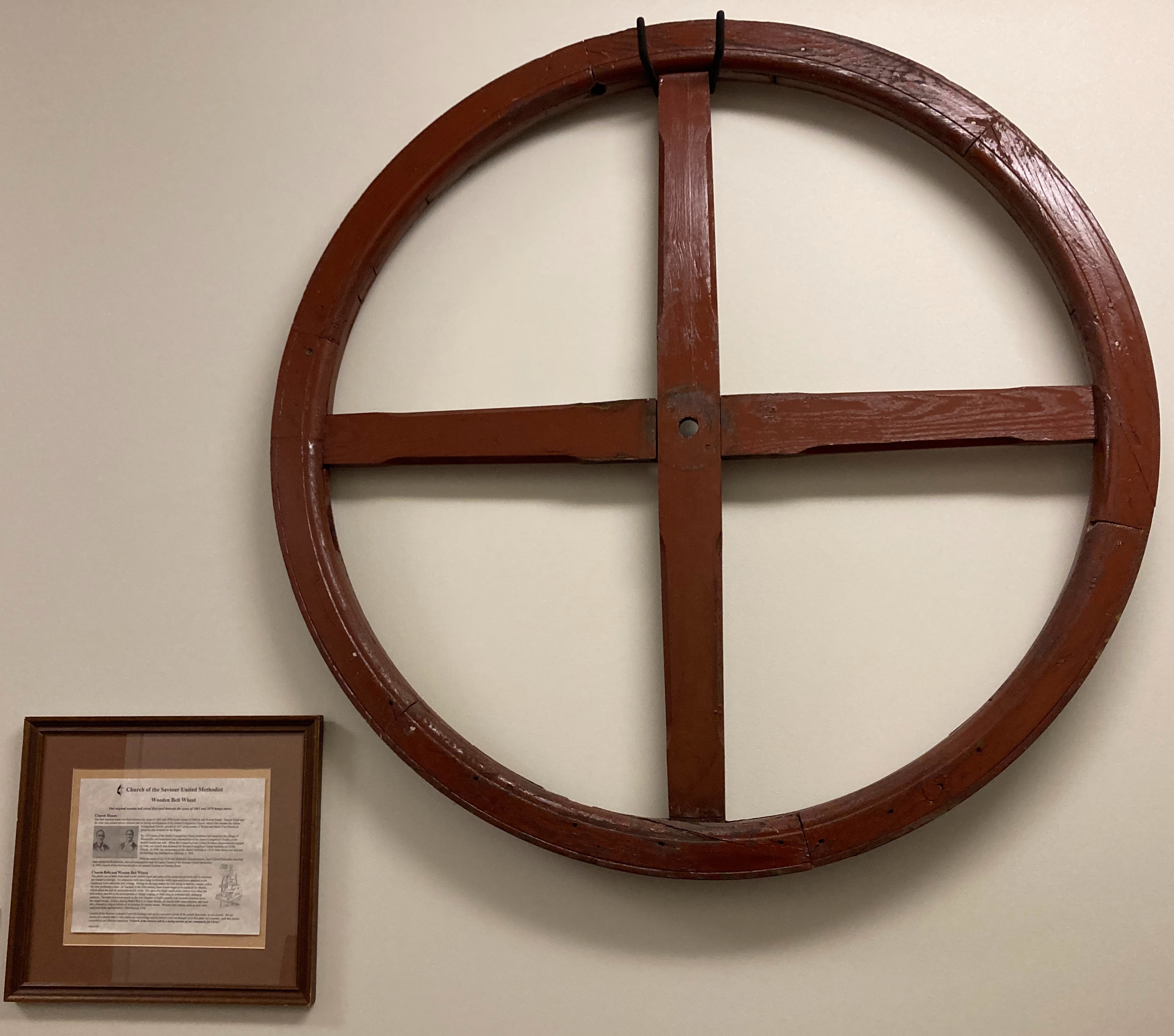 To the right of the church building is a large corn field, owned by the church, stretching to the east. At the time I wrote this blog, Samuel Rigal’s father Philip was a mystery…due to his last name being spelled Riggle. He was a farmer and weaver in Lithopolis. Not sure if he moved to Plain Township. But…he’s now been found and is one and the same…and another coincidence. He’s interred not far from the cemetery of his wife, daughter and son: in Fancher Cemetery right next to the cornfield of Church of the Saviour!!!It’s hard to see, but in the upper middle in the above picture is the church (faint white to the right of the pine tree). I took this photo standing in the cemetery. Two amazing coincidences: the son near the second edition of old Salem Evangelical and the father near the third edition of old Salem Evangelical. Below, a view of the cemetery location (other side of pine trees) from the church parking lot.A survivor from Salem Evangelical Church: its wooden bell wheel. This hangs in the hallway of the Fancher Road building. Next to it is a framed history of the church (including the enlargement below) written by Deb Gifford, Administrative Assistant.This picture is from the Fancher Road church files. The reverse side says “Interior view of old church. South side.” Dated 3/11/1949.Reverse side of the stationery on which church history is typed. Interesting! Westerville was home base for the Anti-Saloon League, an organization that championed and authored the Prohibition Amendment. The American Issue Publishing Company was its war-on-liquor machine. Was the church historian an ASL employee? This is from the files housed at the Fancher Road church as shown to me by Deb Gifford.The above article is from Otterbein Towers, Spring/Summer 2004 issue. The Frank Museum of Art has rotating exhibits and is open to the public. Photo credit: Otterbein University Digital Commons.And finally…mid-2023 additions to the front of the old churchand to the front of the former Anti-Saloon League building.