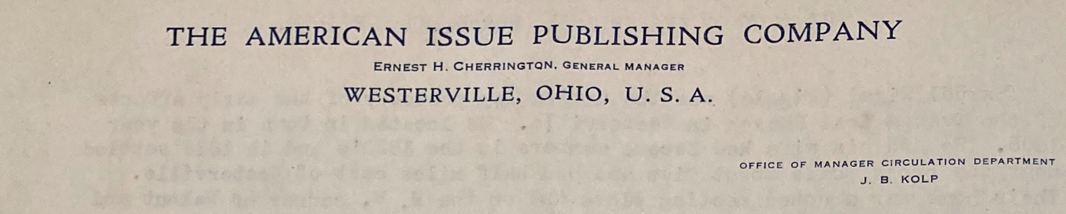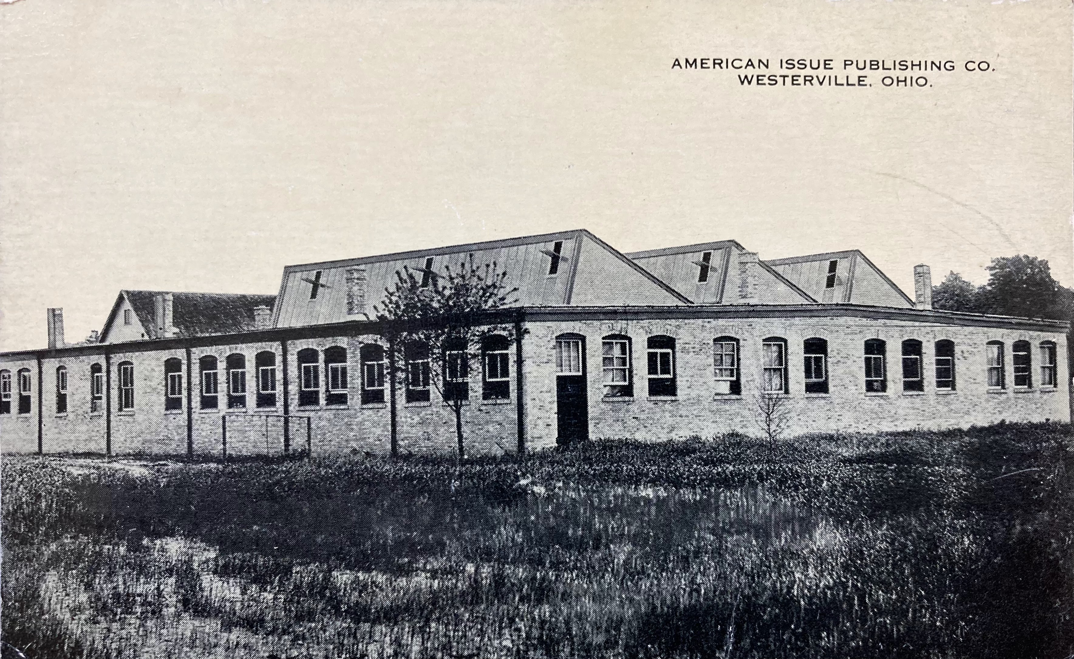 Now to the Rigals. Samuel, of Bloom Township in Fairfield County, married Sarah Hoy who was the widowed daughter of Daniel and Molly Hoy of Bloom Township. The couple settled circa 1830 in Plain Township of Franklin County four miles east of Westerville where Samuel opened a sawmill. They donated land and lumber for the construction of Bethel Church in 1850 at the corner of Walnut Street and Harlem Road. Bethel became part of the Gahanna Mission of the Evangelical Association (“Church” later replaced “Association” in the denomination name). In 1865, the Rigals left their sawmill business and Bethel Church membership, moved to Westerville, and acquired land on the largely undeveloped east side of State Street. Sarah passed away shortly after the move (Samuel later remarried). A Google search of “Rigal” lead to a description of the house they built as “a spacious and comfortable mansion, with handsome grounds around it.” The “mansion” clue led to identifying the actual house from a picture in the archives of the Westerville History Center and Museum. Today the house no longer stands and is the site of the Masonic Temple locatednext door to the Westerville Public Library. Dr. Harold Hancock’s History of Westerville, Ohio includes a chapter of reflections by Frank Sked who was a lifelong resident (1857-1944). The reflections were published during the 1930’s in the local Public Opinion and included the following two statements: (1) “Mr. Riggle owned all the ground not occupied by the Anti-Saloon League.” and (2) “Mother Riggle, who lived where the Anti-Saloon League is now located, made butter and cheese. I always got a drink of buttermilk at her spring house.” Note that Rigal was misspelled as Riggle. (Other recorded misspellings of Samuel’s last name include Riggle, Riggal, Reigel, Riegle.) The Anti-Saloon League was located where the Westerville Public Library stands today and includes the original building housing the ASL administrative offices.