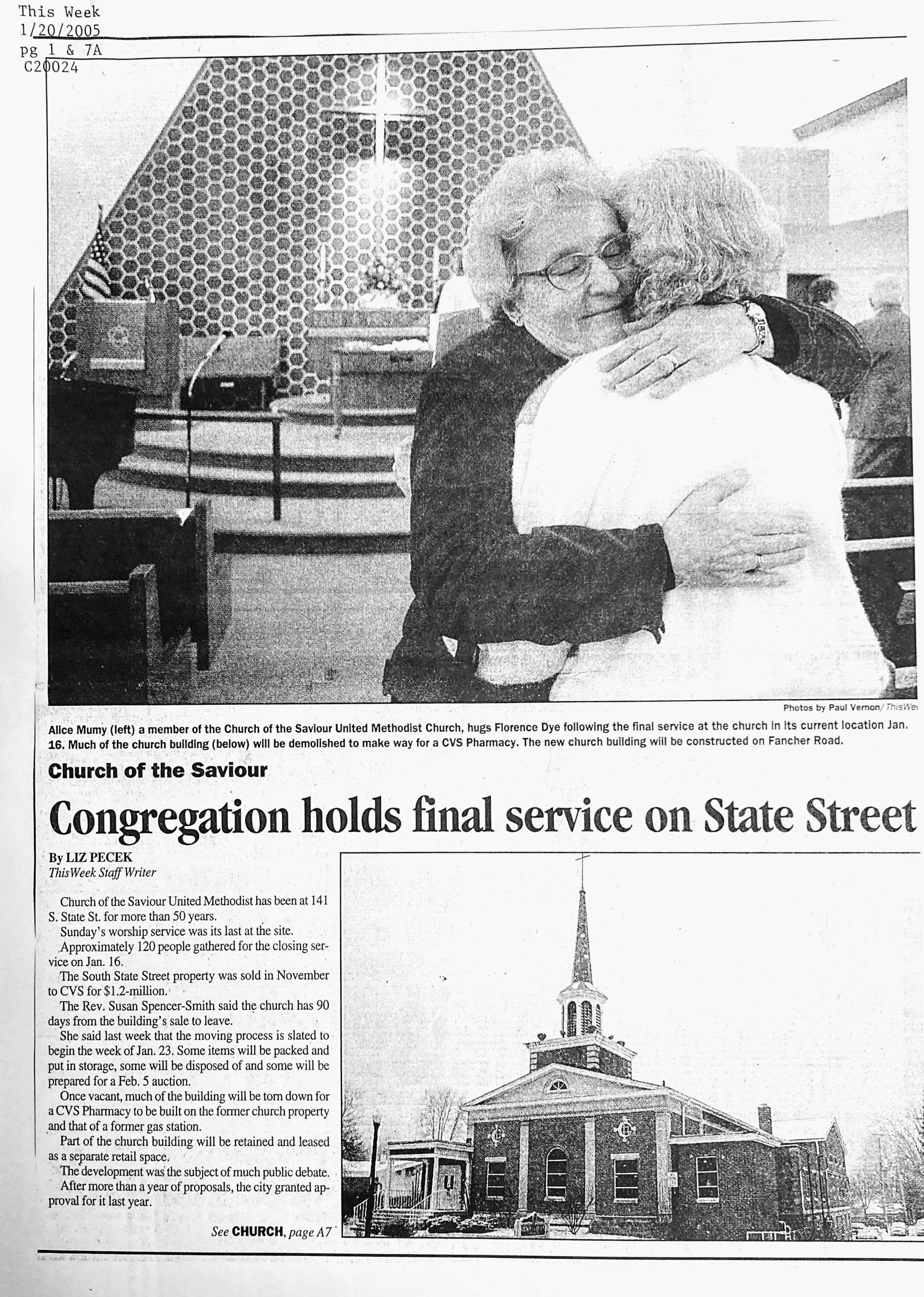 Church of the Saviour added an educational wing in 1963. Eventually, a lack of air conditioning and handicap accessibility contributed to the decision to sell the building to CVS Pharmacy and purchase twenty-four acres of land on Fancher Road for a new facility. A closing ceremony and final service was held at State Street on February 16, 2005. CVS built on the corner lot next door and saved the front portion of the church for lease as retail space. The educational wing was demolished and the space used for CVS customer parking. Salem Evangelical Church had been sold to the Westerville Grange which occupied the space until 1956 when it built a new facility on East College Avenue. Dr. Paul and Lillian Frank, Otterbein faculty members, purchased Salem from the Grange and made this their home until donating it to Otterbein University in 1999. Today the former 1877 Salem Evangelical Church houses the Frank Museum of Art.