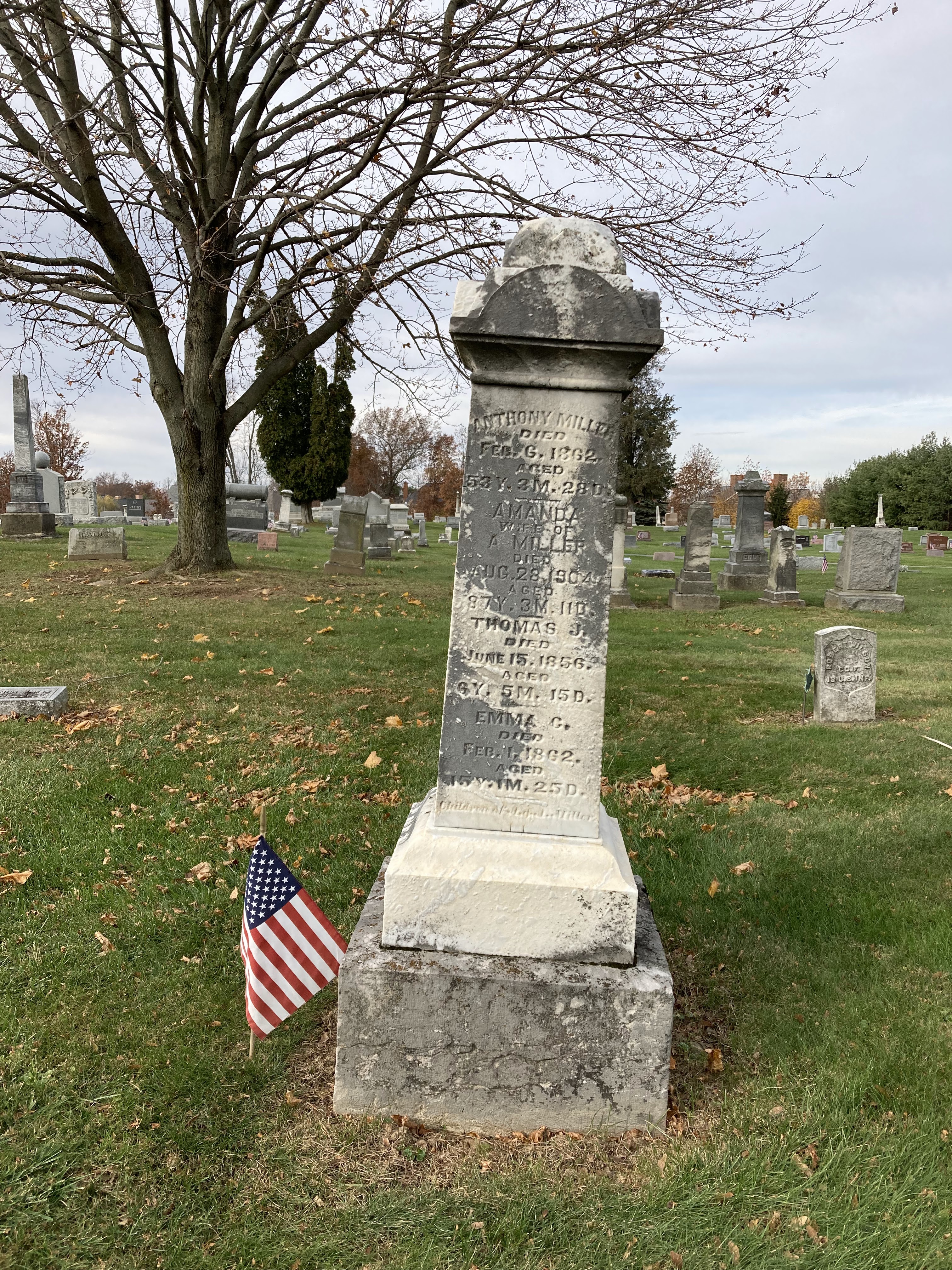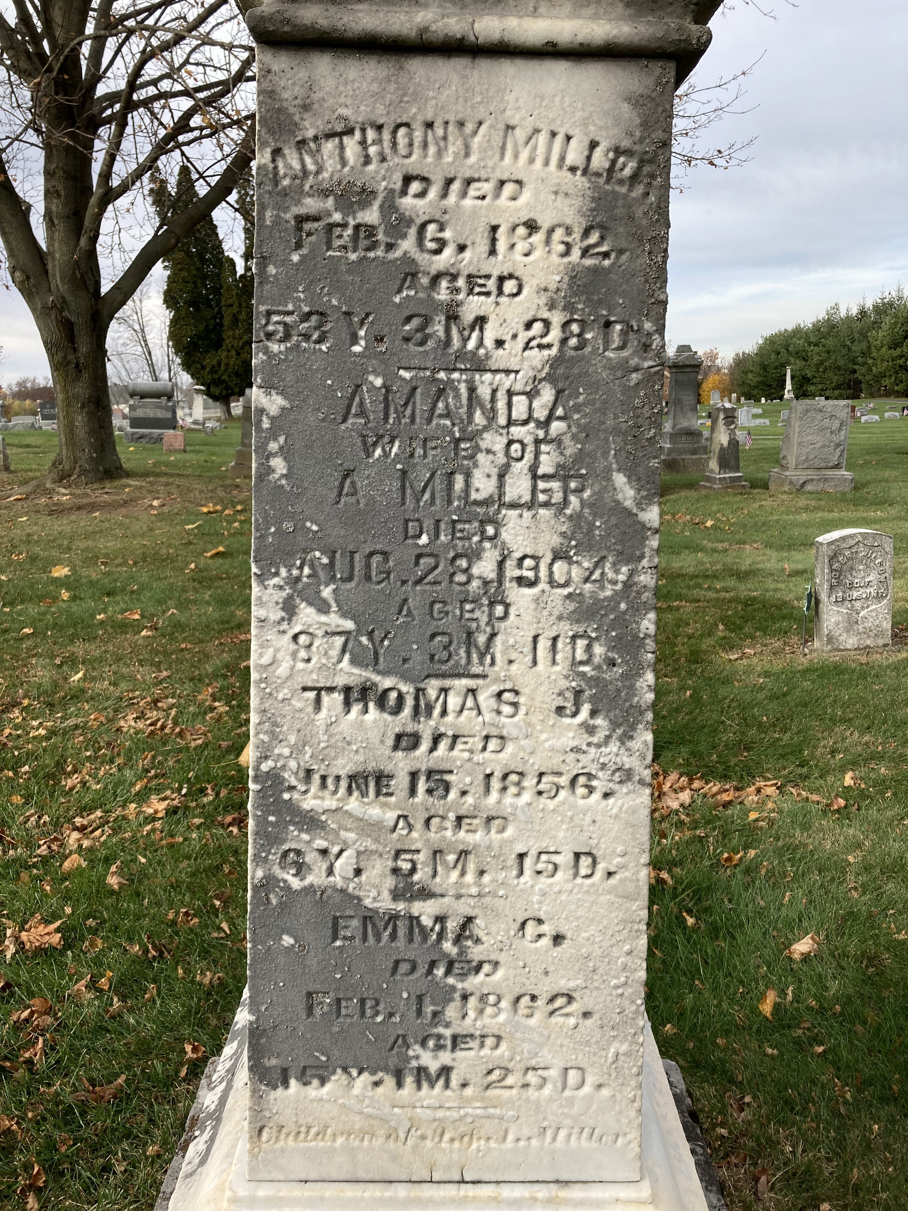 Amanda is buried just a couple miles from Samuel at Maplewood Cemetery in Plain Township, New Albany. The monument is inscribed with several Millers including Amanda and her first husband Anthony on the front side.