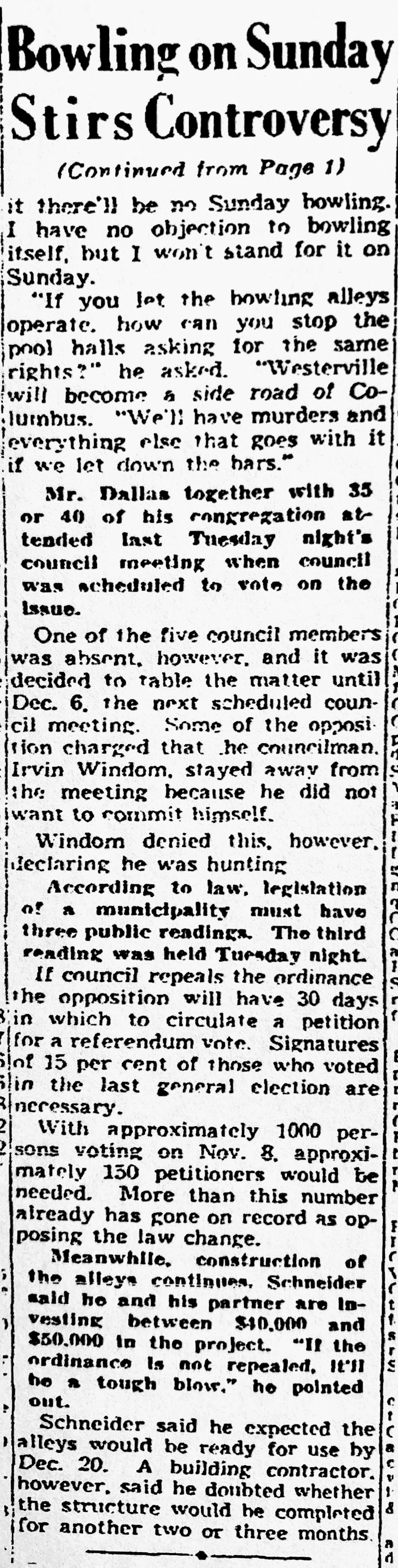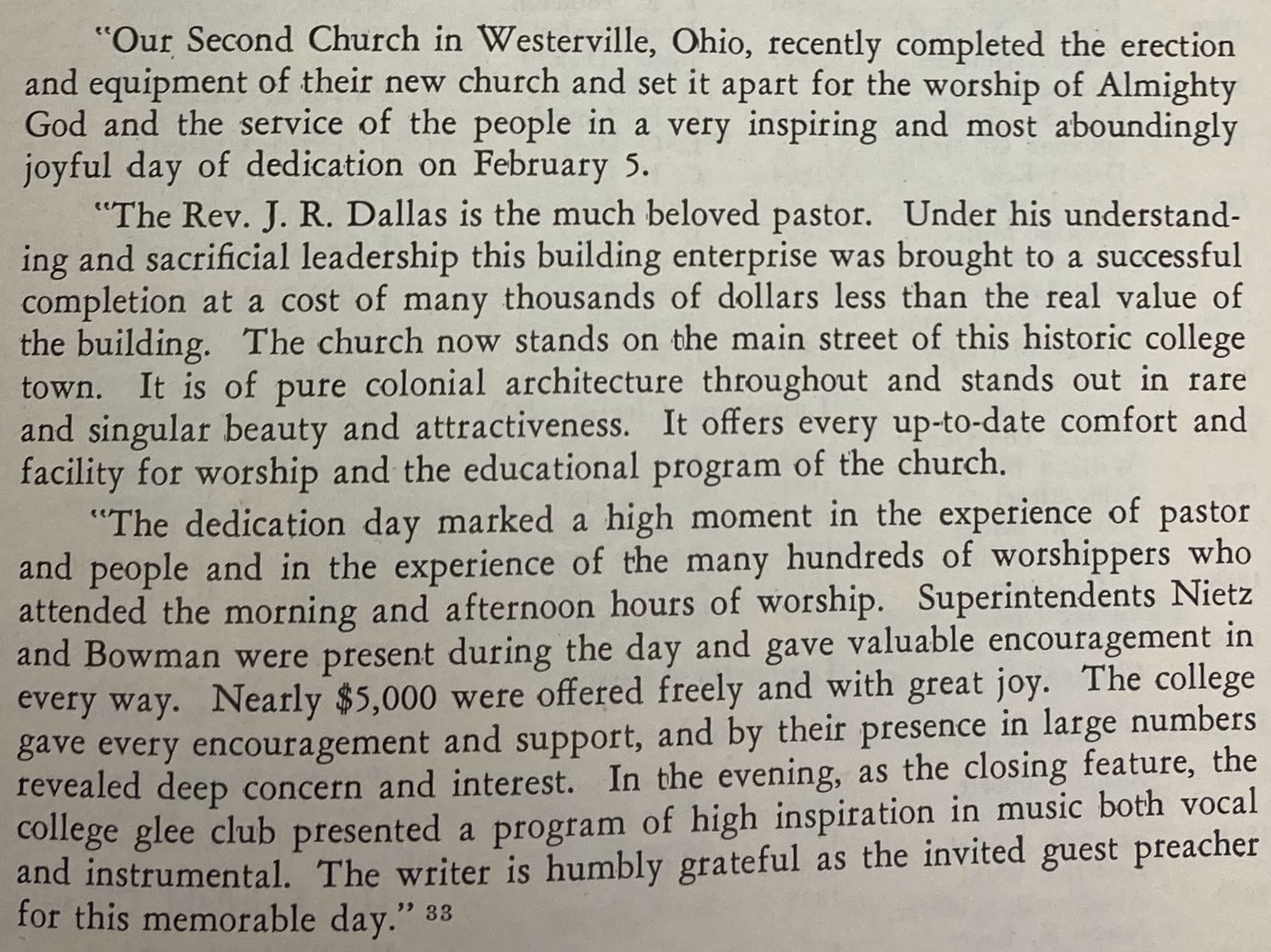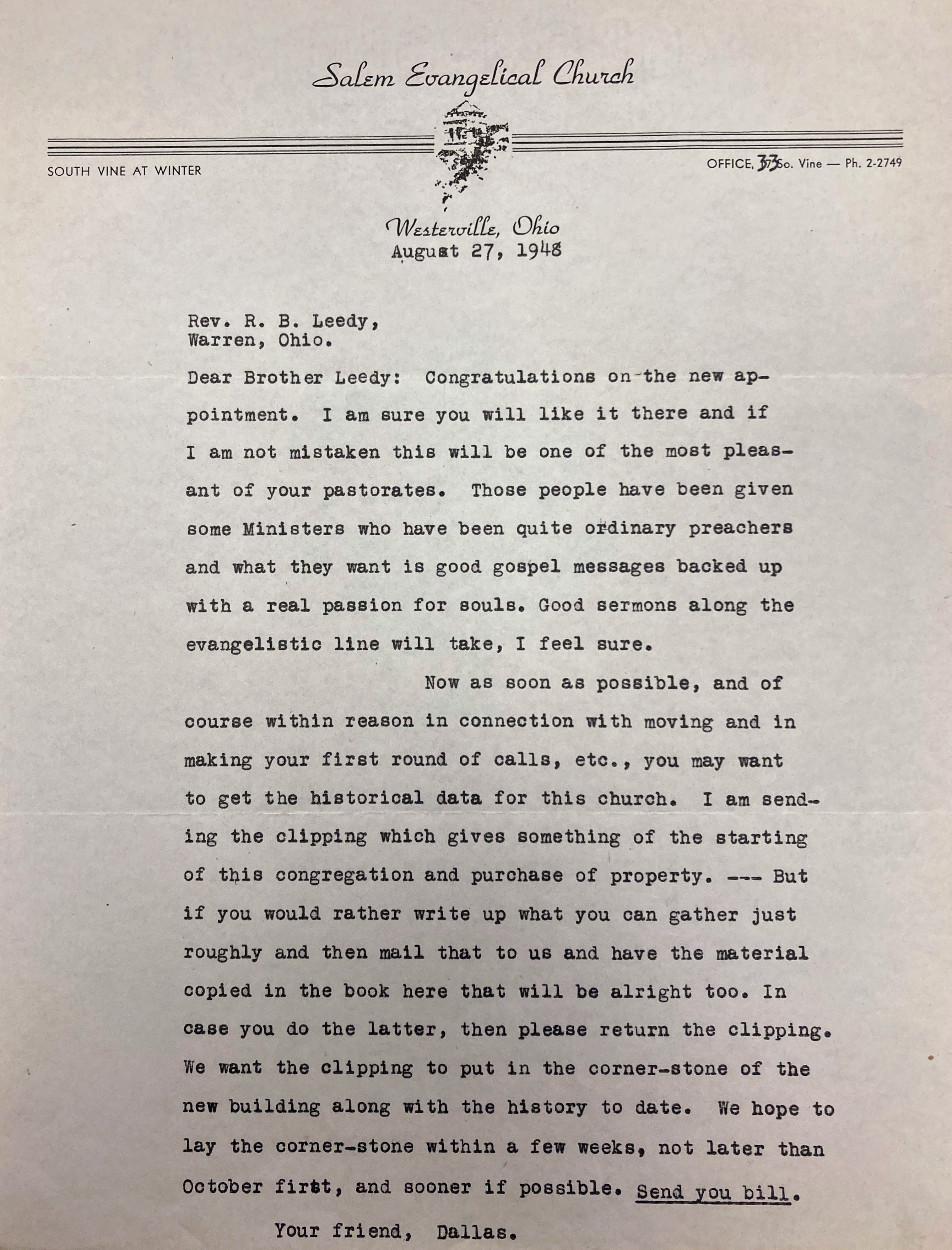This list of Salem church pastors is from the Archives of Ohio United Methodism.The Columbus Dispatch 11/29/1927. Above and below.The letters above and below were written to eventual Evangelical Church historian Rev. Roy B. Leedy by Salem pastor Rev. J.R. Dallas in reference to the cornerstone laying for the new building planned for South State Street. Two different letterheads here reflecting the merger of the Evangelical Church with the United Brethren Church. Photo credit: Archives of Ohio United Methodism.Salem Evangelical Church moved to a new building on South State Street in 1950. Four years prior to that, its name changed to Second Evangelical United Brethren Church.This is a page from The Evangelical Church in Ohio 1816-1951. The significance is the last sentence. Author Roy B. Leedy was the guest speaker at the dedication of the new South State Street buiding.Here’s an issue that Second Evangelical was vocal about. Note in the continuation of the article (below) the number of church members opposed to Sunday bowling. The Columbus Dispatch 11/19/1949.