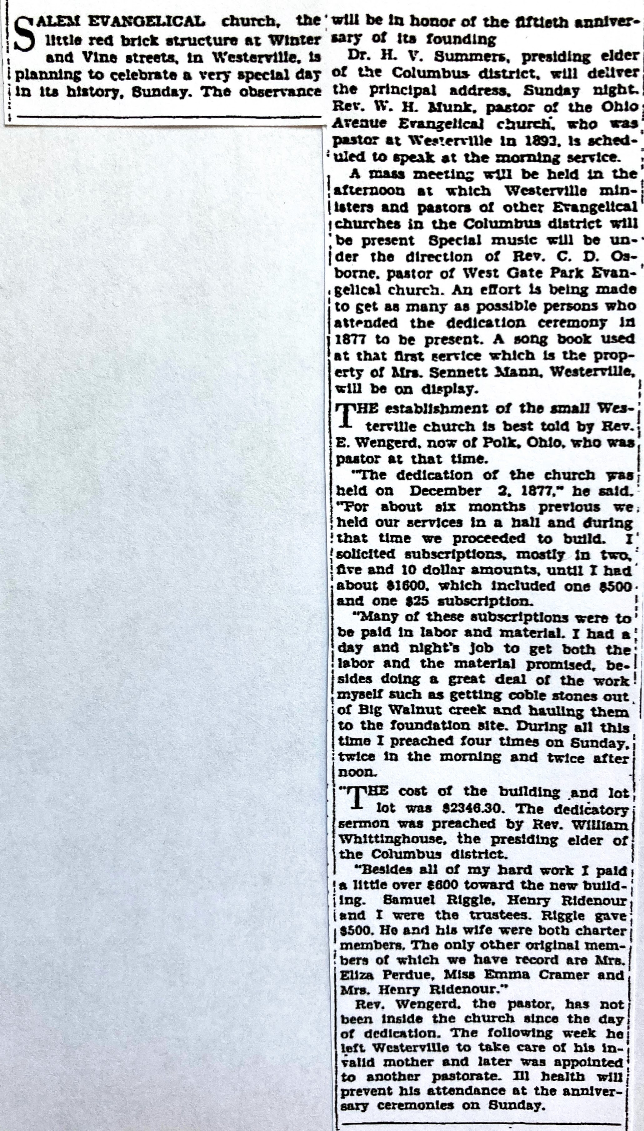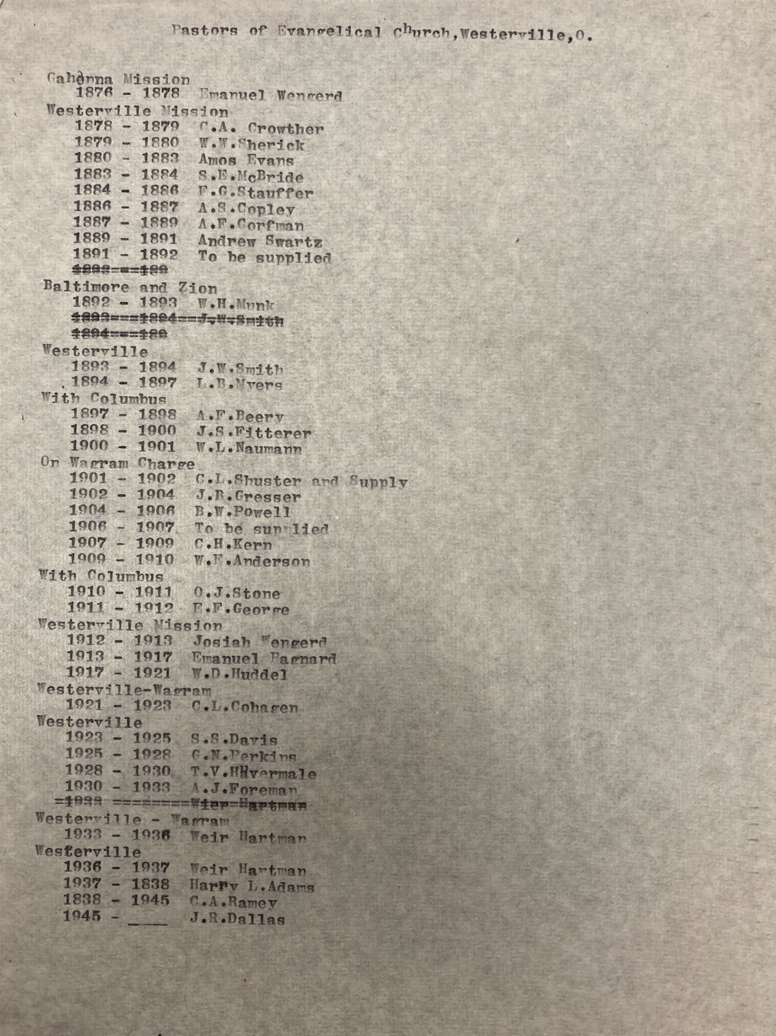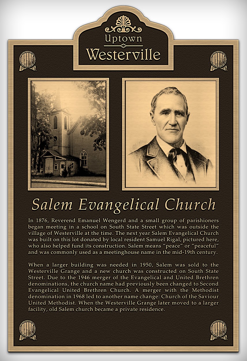 The events in the life of Salem Evangelical Church from 1877 to the building’s closure in 1950 remain unknown. But this research did lead back to a church outside Lithopolis that likely motivated the creation of the Westerville church (and its name), discoveries of the gravesites of Samuel Rigal and Emanuel Wengerd…and what I conclude are a series of unique connections:
