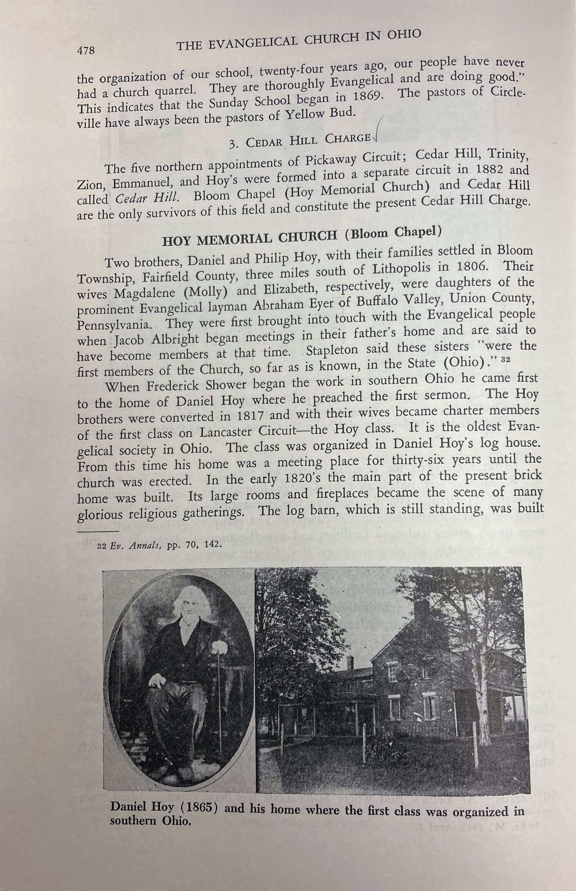In 1807, Daniel and his brother Philip donated land in Bloom Township near Lithopolis for a Lutheran church and cemetery. Constructed of logs in 1809, it’s referred to in historical records as the Salem Reformed Church and in others as the Glick/Salem Brick Church…Glick because Glicks and Hoys were among the earliest Bloom Township settlers and sometimes “Brick” because the log structure was replaced by one made of brick. At an 1816 service, sisters Molly and Lizzie Hoy (Lizzy married Daniel’s brother Philip) converted to the Evangelical faith thus becoming the first members of the Evangelical Association of Ohio. The Lutheran church eventually became Bloom Chapel Evangelical Church.