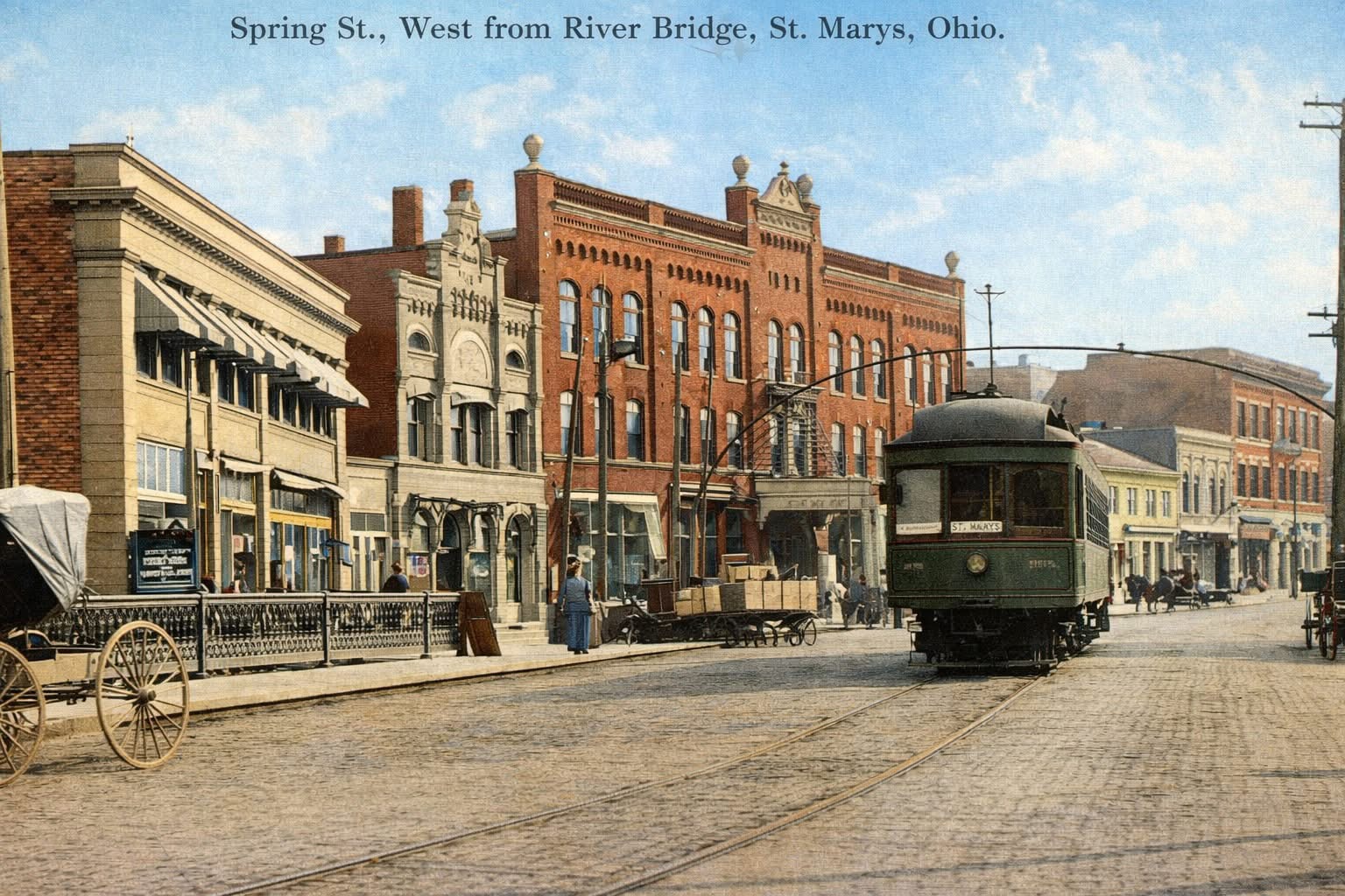 St. Marys: Business block for Grand Opera House, Knights of Pythias #219 and Masons #121. 105-113 West Spring Street. Built 1895. Designed by Yost & Packard.Photo credit: Auglaize County Historical Society.Photo credit: Facebook page of St. Marys, Ohio history.And with the above action, the first floor of the Grand Opera House disappears beneath a raised Spring Street!!Today the building houses some retail and, as mentioned in the blog narrative, the original first floor is below street level. The rear of the building looks original as shown below.The Grand Opera House business block is in the middle of the strip of buildings shown on the left above. This is what Spring Street looked like after the street was raised which included a new bridge over the river.The result was that the first floors of these buildings basically became basements. The building in the left front corner above is pictured below as it appears today.St. Marys: 3 room addition to the north wing of East School. 424 East Spring Street. Added 1896. Design by Yost & Packard. Razed.St. Marys: Gustave Bamberger residence. 225 South Wayne Street. Built 1895. Design by Yost & Packard. Current owners Jason and Andrea Clark discovered the signature of the contractor within the interior construction and thought that person was the architect. Fun surprise! Gustave Bamberger, at age 16, was a clerk in his brother’s clothing store located across the street from the Grand Opera House.These five color pictures above and below were provided by the Clarks.Wapakoneta: Library/Y.M.C.A. addition to Blume High School campus. South Blackhoof Street. Built 1923. Designed by Packard.Wapakoneta: St. Joseph School. 107 West Pearl Street. Built 1899. Designed by Yost & Packard. Now St. Joseph Faith Center. Listed on the National Register of Historic Places.